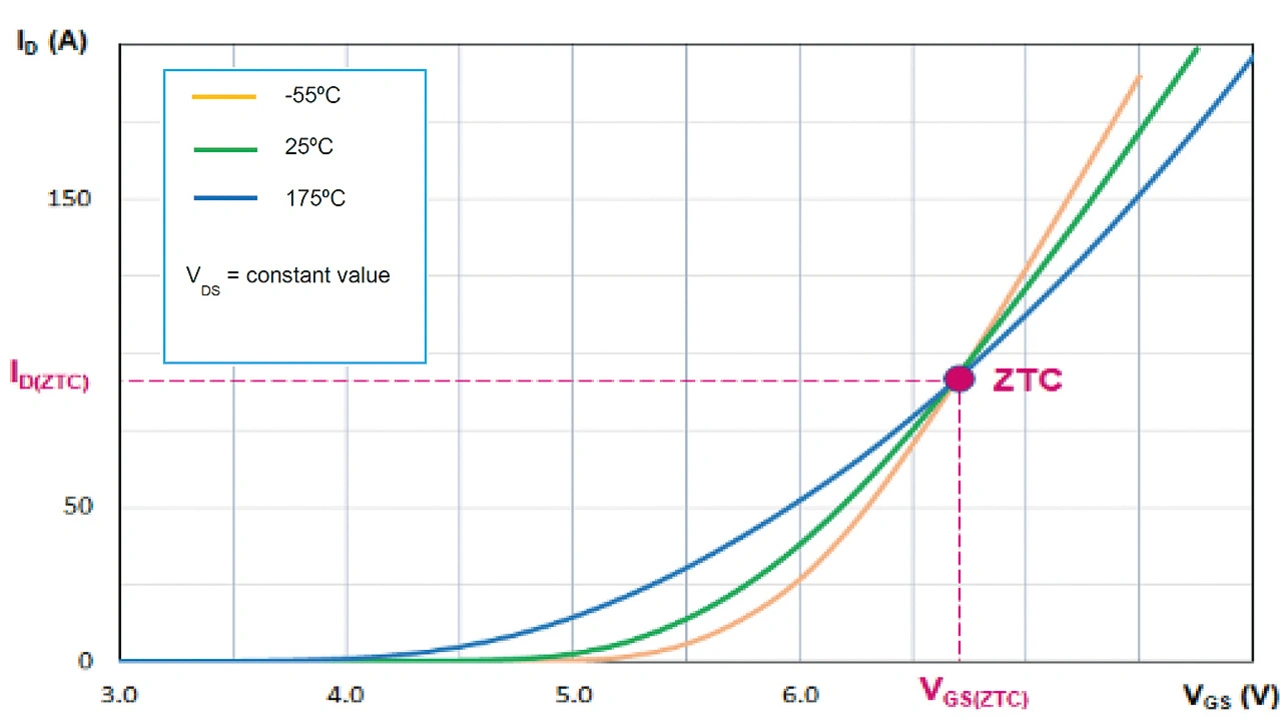 Die wichtigste Kennzahl, an der sich die Leistungsfähigkeit im linearen Betrieb ablesen lässt, ist der Temperaturkoeffizient (TC) des Drain-Stroms ID. Dieser Koeffizient kennzeichnet die Fähigkeit des Bausteins, seinen Strom bei hohen Temperaturen und Spannungen eigenständig auszugleichen. Es handelt sich hierbei um einen technologieabhängigen Parameter, der mit der Übertragungskennlinie des MOSFETs und ihrer Temperaturabhängigkeit zusammenhängt (Bild 5). Der Schnittpunkt der drei Übertragungskennlinien heißt ZTC (Zero Temperature Coefficient):