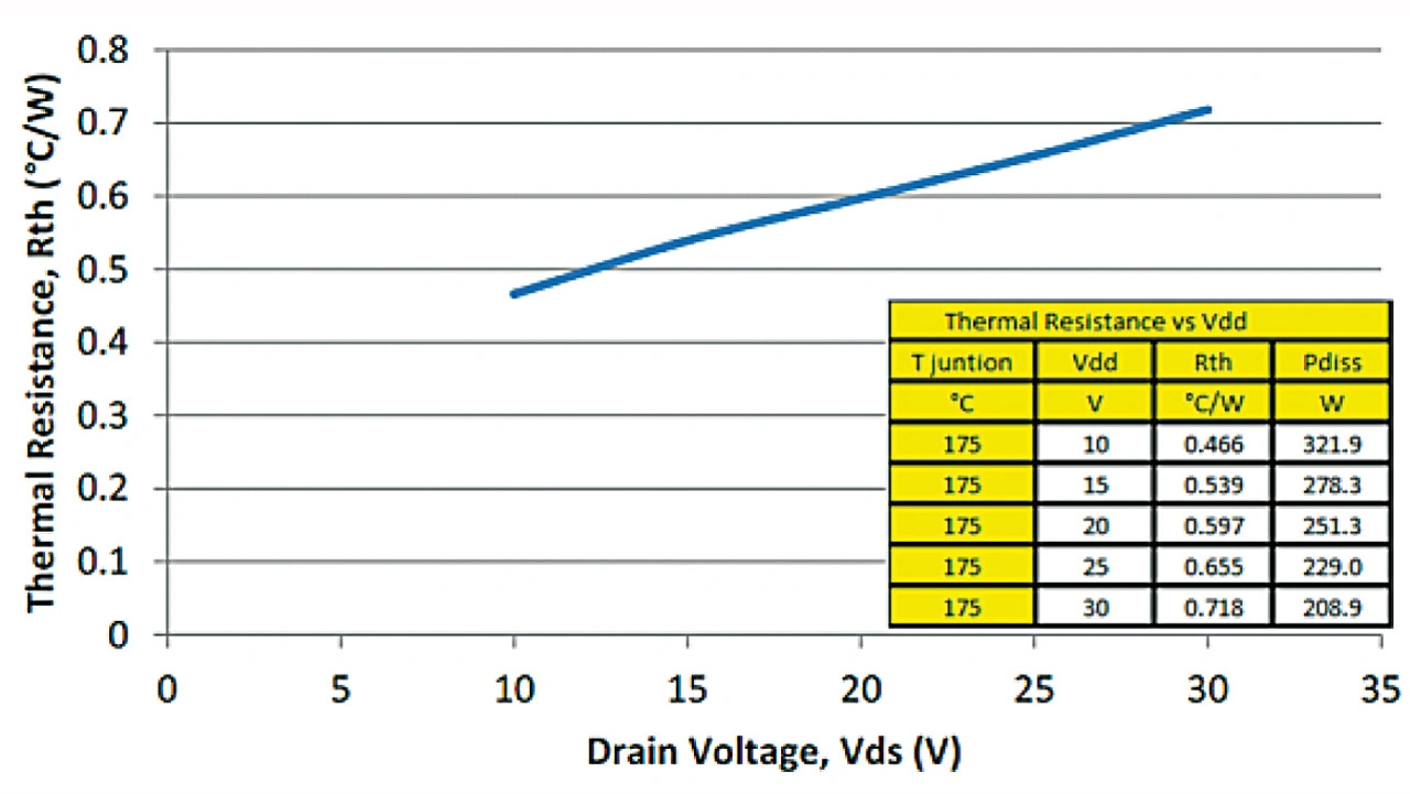 Bei Leistungs-MOSFETs für niedrige Sperrspannungen ist der Wärmewiderstand von mehreren Faktoren abhängig. Eine Rolle spielen individuelle Merkmale des jeweiligen Bausteins, wie etwa die Gehäusebauart sowie die Fläche und Dicke des Chips. Abgesehen davon können sich aber auch Unstimmigkeiten im Die-Attach-Prozess (Hohlräume, Voids) dramatisch auf den thermischen Widerstand auswirken und dazu führen, dass die Temperatur in kleinen Bereichen des Chips zunimmt.