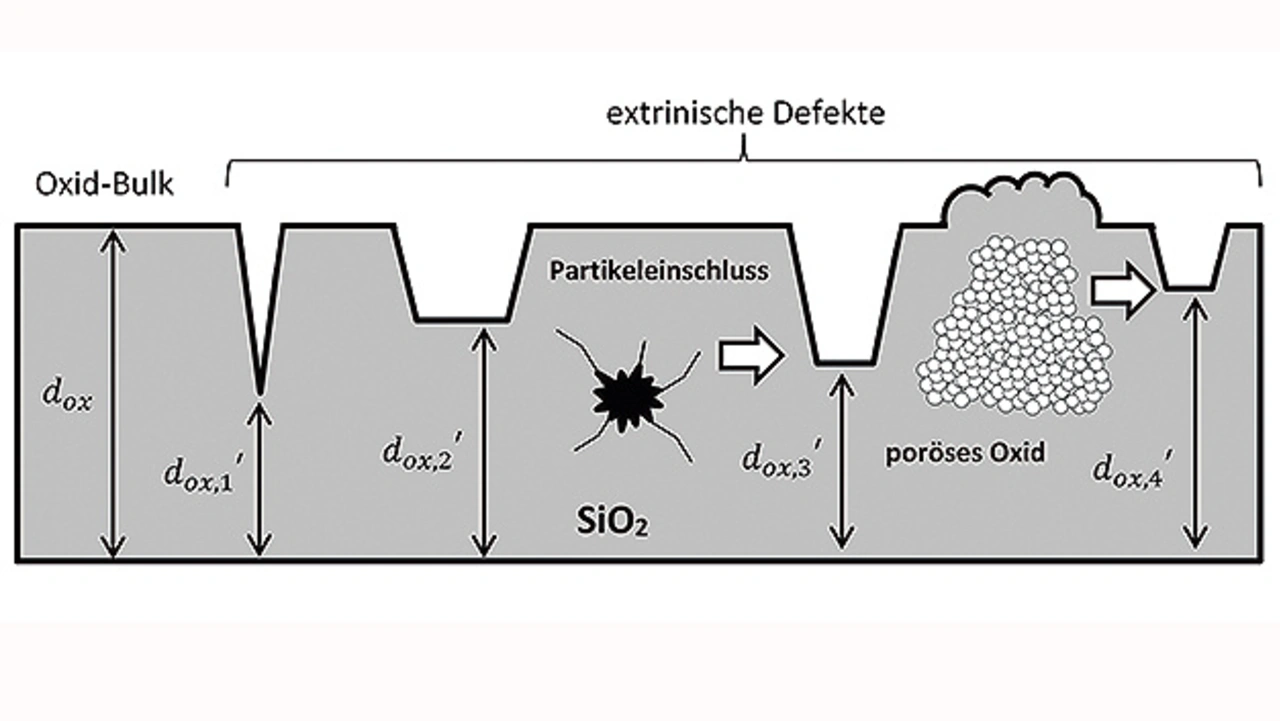 Dabei handelt es sich um winzige Verzerrungen bzw. Störungen im Gate-Oxid, die im Prinzip so wirken, als wäre das Oxid an diesen Stellen dünner. Derartige Störungen stehen oft in Zusammenhang mit Epitaxie- oder Substratdefekten [1], metallischen Verunreinigungen, Partikeln oder anderen extrinsischen Einschlüssen im Gate-Oxid, die während der Herstellung der Bauelemente eingebracht wurden (Bild 1).