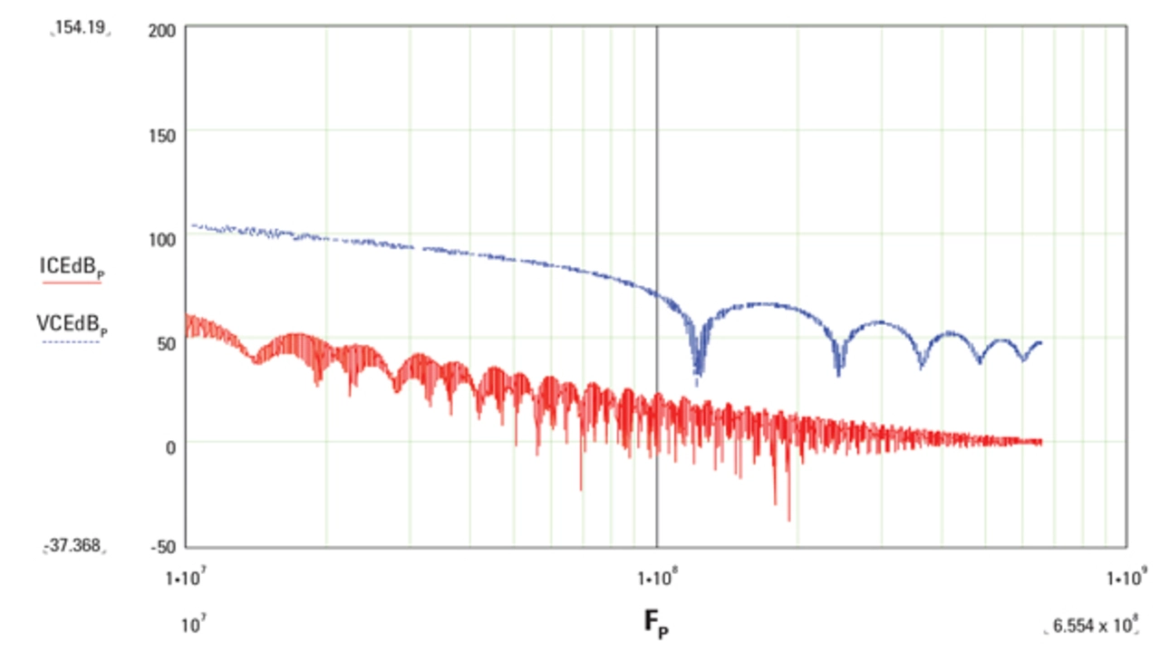 Durch das mathematische Modell sowohl für Spannungen als auch Ströme lassen sich mittels einer schnellen Fourier-Transformation (FFT) die Emissionsspektren aufzeichnen (Bild 2). Man beachte, dass es sich hier um die FFT der Verläufe von Spannung und Strom handelt, wie sie durch eine einzige Schalterkommutierung generiert werden. Man hat es also nicht mit den geleiteten oder abgestrahlten Emissionsspektren einer spezifischen Applikation zu tun. Zu deren Umwandlung in die abgestrahlten und geleiteten Emissionsspektren, wie sie in jeder Anwendungsplatine gemessen werden, wäre eine vollständige Analyse der Anwendungstopologie erforderlich, einschließlich der Anzahl von kommutierenden Schaltern, deren PWM-Struktur, der Auswirkung der Eingangsfilter und des LISN sowie des Antenneneffekts des Leiterplattenlayouts.