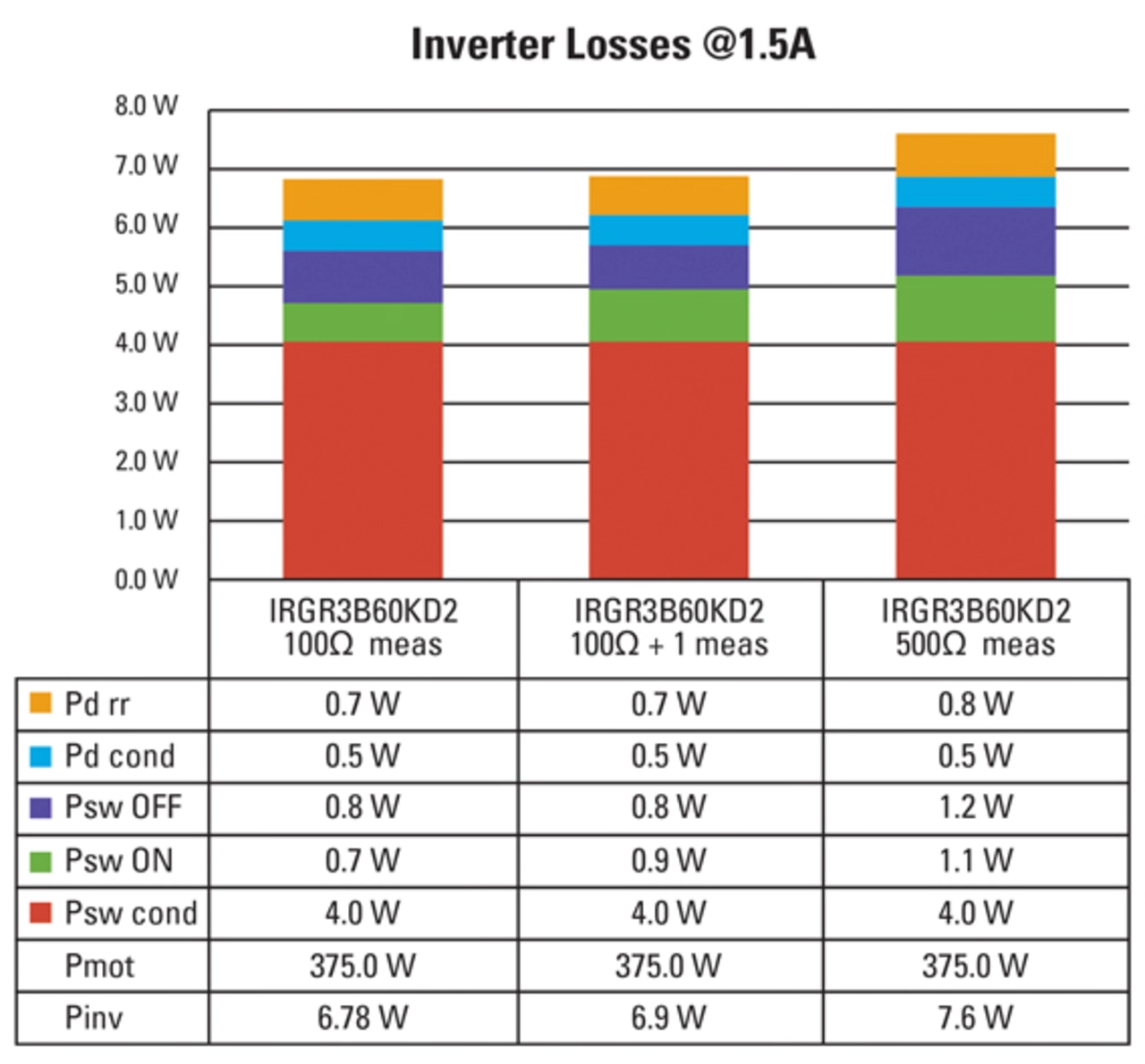 Bild 3 vergleicht gemessene Leistungsverluste eines dreiphasigen IGBT-Wechselrichters, der eine Motorlast mit 1,5 A versorgt. Dabei zeigt sich, dass eine Erhöhung des Gate-Widerstands RG von 100 Ω auf 500 Ω die Einschaltverluste merklich erhöht, während sich das Hinzufügen eines 1-nF-Kondensators zum 100-Ω-Gate-Widerstand nur wenig auf die Wechselrichterverluste auswirkt.