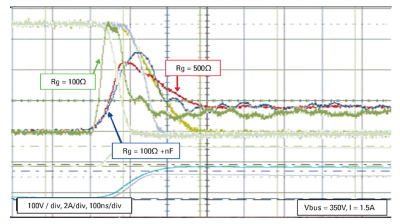 Andererseits zeigen die Bilder 4 und 5, wie die Kombination aus einem RG von 100 Ω und einem 1-nF-Kondensator den Recovery-Spitzenwert und infolgedessen die EMI auf ein Niveau reduziert, das im Vergleich zur Verwendung eines RG von 500 Ω günstig ausfällt.
