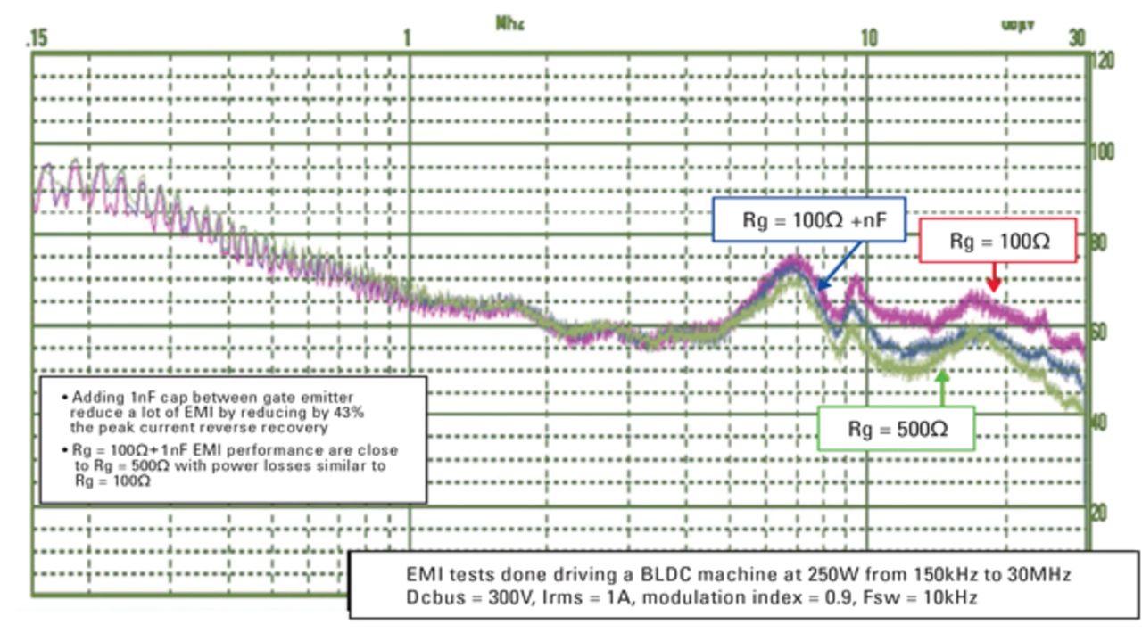 Eine Methode, das Störspektrum des Stroms zu verringern, besteht darin, das di/dt beim Einschalten zu reduzieren, was wiederum den Spitzenwert des Recovery-Stroms senkt. Das ließe sich einfach durch eine Erhöhung des RG,on erreichen, aber auf Kosten einer erhöhten Verlustleistung. Als Alternative könnte man RG,on unverändert lassen, während ein kleiner Kondensator (zum Beispiel mit 1 nF) zwischen Gate und Emitter geschaltet wird. Auf diese Weise sinken sowohl das di/dt beim Einschalten als auch der Recovery-Spitzenwert, ohne gleichzeitig die Verlustleistung wesentlich zu erhöhen.