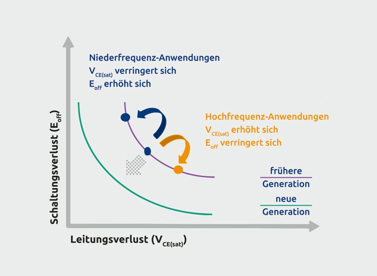 Schalt- und Leitungsverhalten von IGBTs hängen von der Gerätestruktur ab. So trägt die asymmetrische Struktur der IGBTs zur Optimierung der Durchlassverluste und der Schaltgeschwindigkeit in Motorsteuerungsanwendungen bei. Hauptmerkmal dieser Struktur ist die Feldstoppschicht, die durch einen n+-Pufferbereich geschaffen wird, die unterhalb des n–-Driftbereichs und oberhalb der unteren p-dotierten Schicht angeordnet ist. Dieser Pufferbereich dient zur Unterstützung des elektrischen Feldes und ermöglicht einen dünneren Driftbereich, was erheblich zur Verringerung der Leitungsverluste führt.