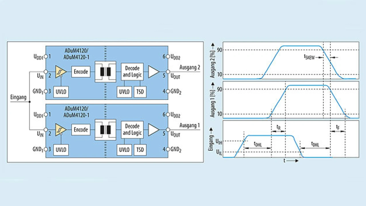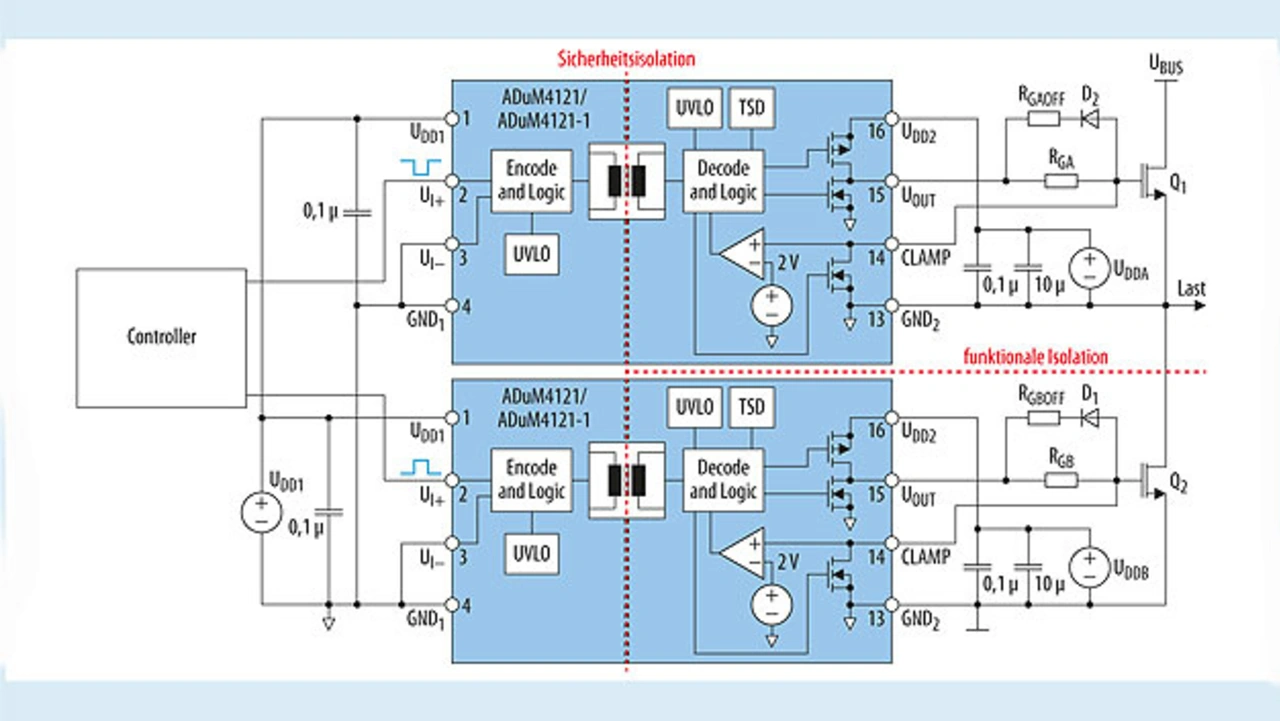Daher sind im Pegel angepasste und auf die Source des High-Side-Transistors bezogene Steuersignale erforderlich. Dies wird als funktionale Isolation bezeichnet und lässt sich mit einem isolierten Gate-Treiber, zum Beispiel mit dem ADuM4223, implementieren.
