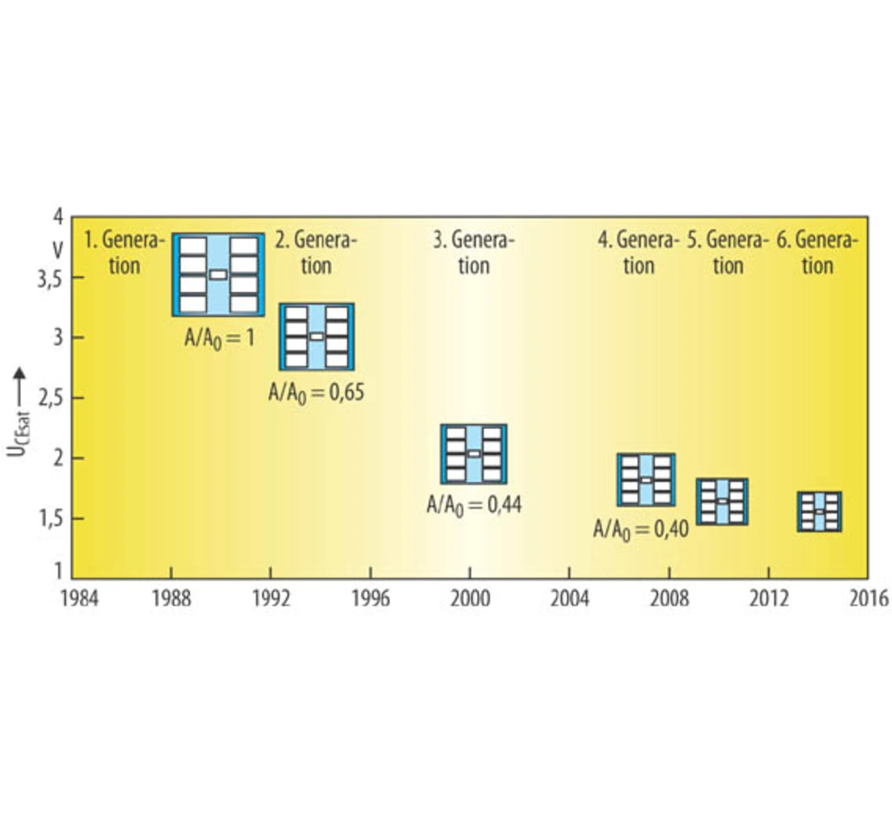 Gemäß diesem Prinzip erleben wir bei Leistungs-Halbleitern eine sehr starke Reduzierung in Größe und Volumen bei gleichbleibenden Strom- und Spannungsdaten pro Bauelement (Bild 1). Wie die IGBTs der ersten Generation arbeiten auch die IGBTs heute mit 1200 V/75 A und einer geschalteten Leistung von 100 kW - allerdings auf nur zwei Fünftel der Fläche.