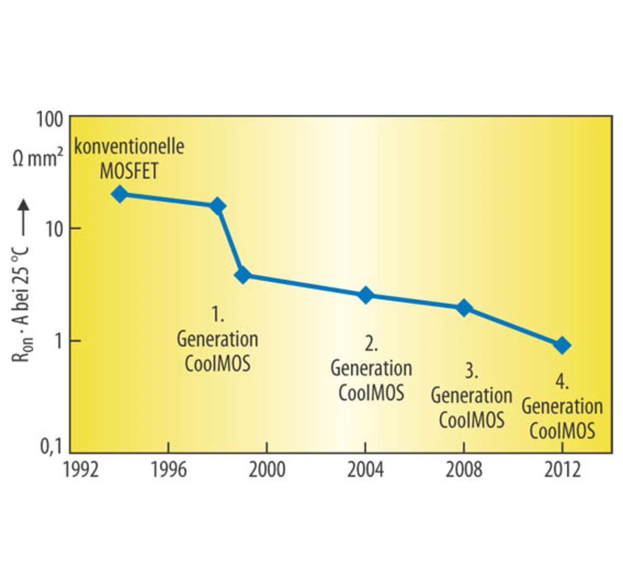 Eine noch viel stärkere Größenreduktion war mit unipolaren Bauelementen möglich (Bild 2): Seit 1993 gibt es bei einem 600-V-MOSFET eine Reduzierung des spezifischen Widerstandes pro aktiver Fläche (Ron · A) um den Faktor 10; das bedeutet, dass heute für den gleichen Ron ein Zehntel der aktiven Fläche verwendet wird.