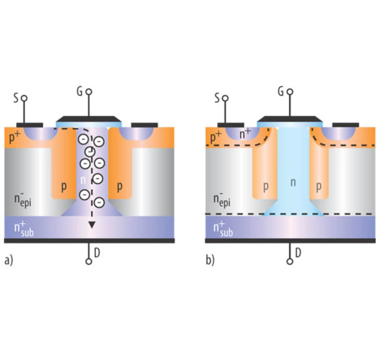 Das Kompensationsprinzip ist in Bild 3 für einen CoolMOS dargestellt [4]. Im eingeschalteten Zustand fungieren die hoch dotierten n-Säulen als ein sehr niederohmiger Leiter. Im Aus-Zustand sind die parallel liegenden n- und p-dotierten Säulen vollständig entladen und wirken sich in der Gesamtheit wie eine Sperrschicht mit einem rechteckigen Feldverlauf aus (wenn p- und n-Ladungen gleich sind).
