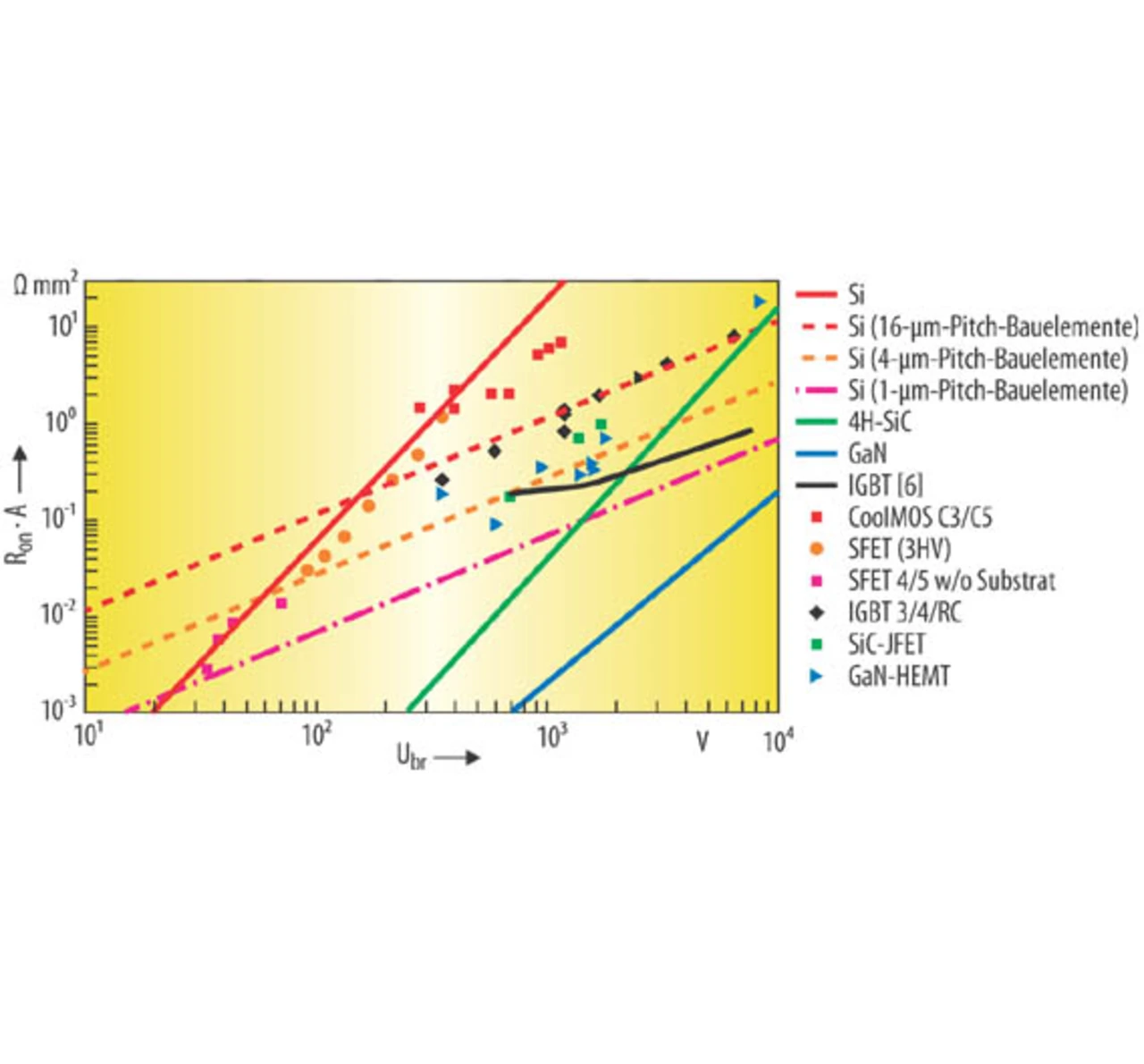 Die durchgezogene rote Linie für Si-Bauelemente wird deutlich von CoolMOS- und Niederspannungs-MOSFETs (SFET-Bauelementen) übertroffen, aber auch von IGBTs, die direkt nach der gestrichelten roten Linie der 16-μm-Pitch-Bauelemente folgen. Die grüne Linie für SiC-Bauelemente ist eine Verschiebung der Si-Linie um einen konstanten Faktor. Real existierende SiC-JFET-Bauelemente sind immer noch um den Faktor 5 entfernt von dieser Linie - das zeigt ihr Potenzial selbst ohne Kompensation! Von neuesten (lateralen) GaN-Bauelementen wird berichtet, dass sie in noch weit größerem Abstand vom idealen berechneten Grenzwert der lateralen Bauelemente liegen (durchgezogene blaue Linie).
