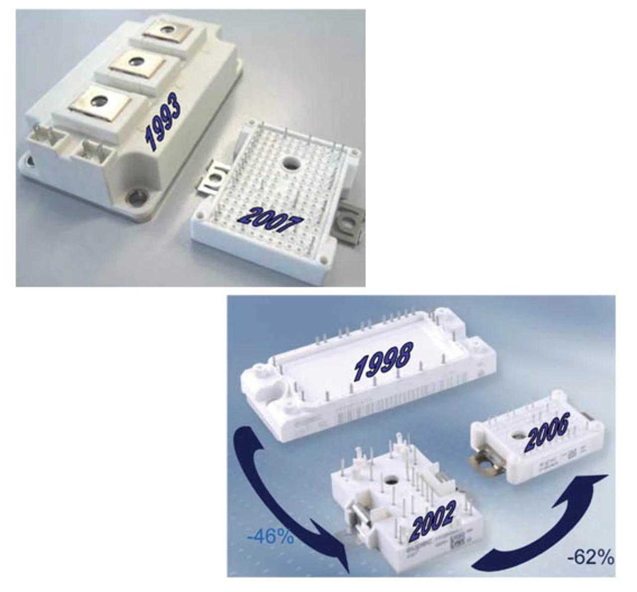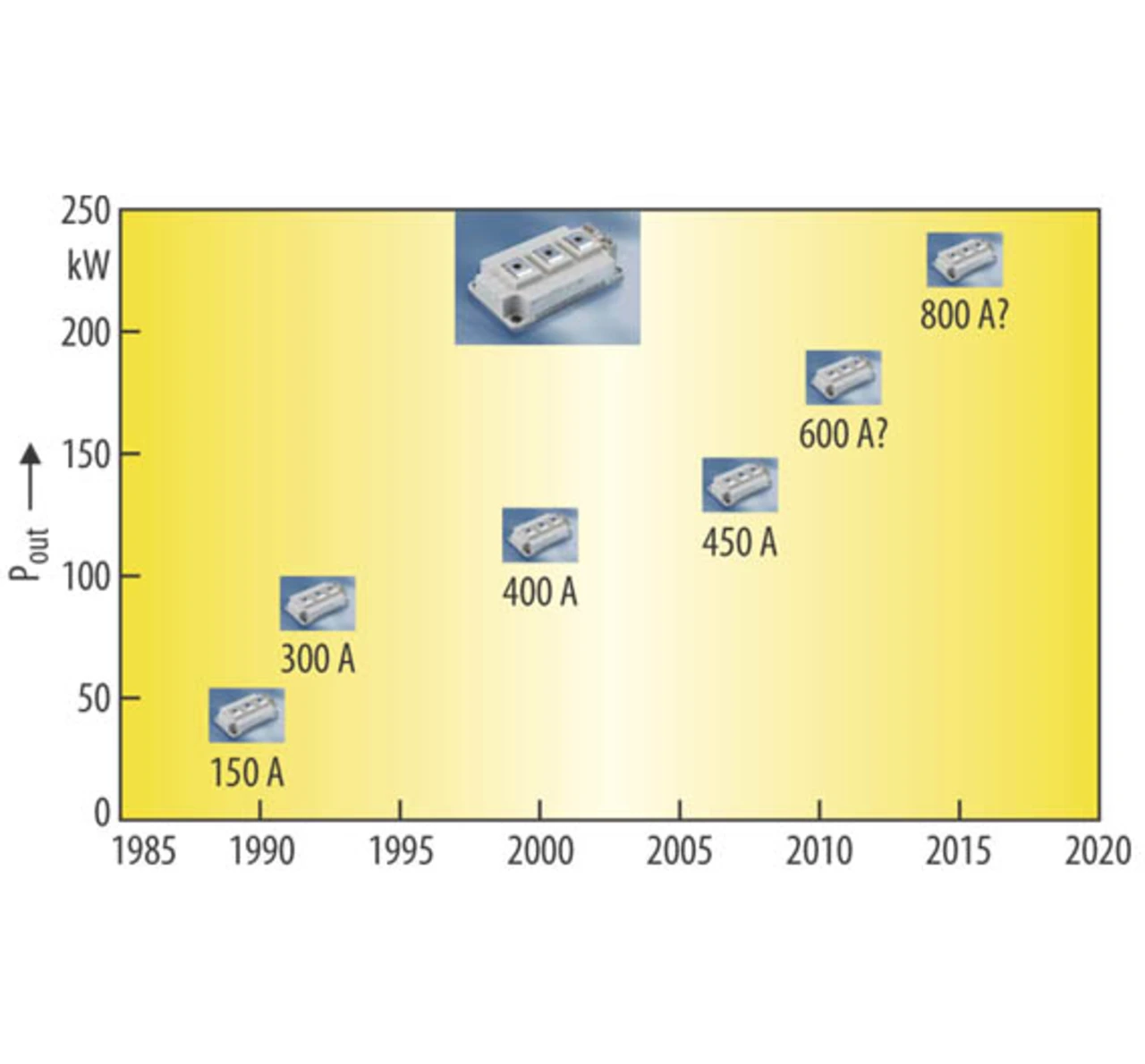 Im Laufe der letzten 25 Jahre wurden mehrere Gehäuse-Standards für bipolare Hochleistungs-Schalter entwickelt, die wichtigsten vielleicht der 34-mm- und der 62-mm-Standard. Begonnen wurde mit 2 × 50 A Schaltern im 34-mm-Gehäuse und mit 2 × 150 A im 62-mm-Gehäuse. Die nächsten Schritte folgten mit den neuen Chip-Generationen mit einer Erhöhung des Stroms in bestehenden Gehäusen (Bild 5).