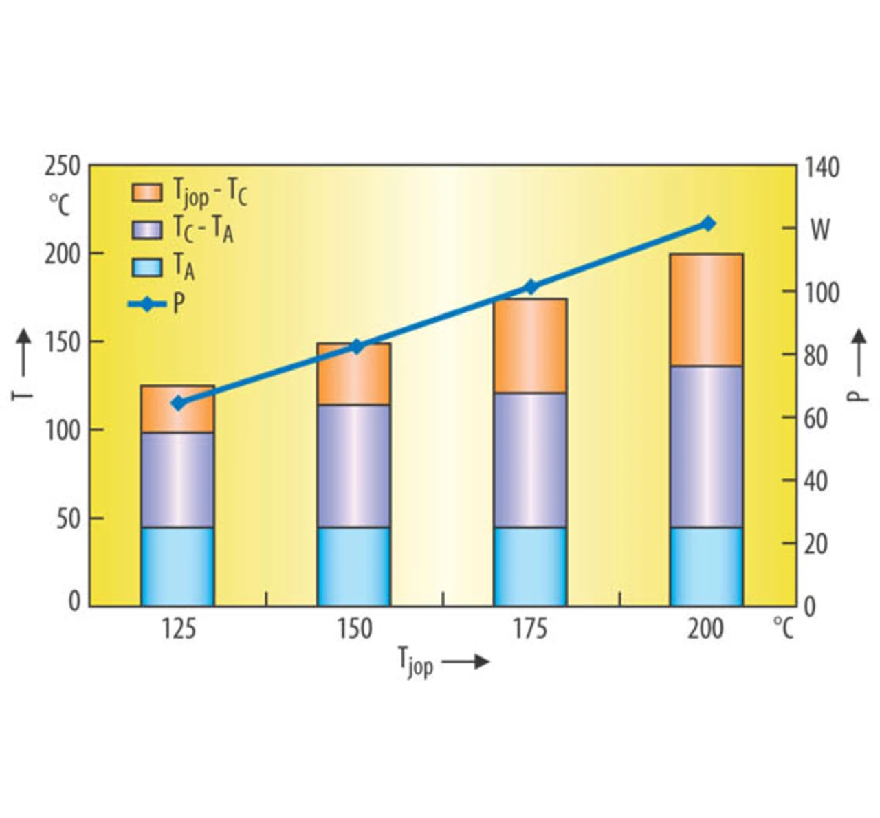 In Bild 7 wird für ein bestehendes Gehäuse die Leistungsfähigkeit in einem luftgekühlten System dargestellt. Ohne jede Änderung der Verbindungs-Technologien ermöglicht eine Erhöhung der Tjop von 150 °C auf 200 °C eine Steigerung der Verlustleistung um 40 % und damit eine höhere Ausgangsleistung. Diese höhere Tjop kann bereits mit Si-Chips erreicht werden; mit neuem Material SiC sogar noch leichter. Einzige Einschränkung ist die Zyklenfestigkeit über die Lebensdauer der Verbindungen [7].