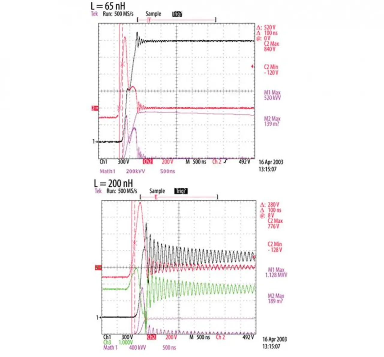 Doch auch in höheren Spannungsklassen führen Probleme bei Verbindungen mit zu hohen Induktivitäten und speziell bei zu hoher Streuinduktivität im System zu einer starken Spannungsüberhöhung und zu Oszillationen (Bild 8).