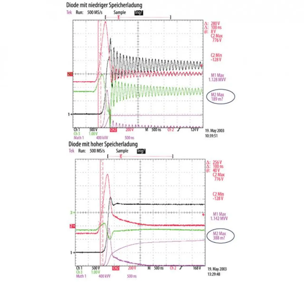 Die hohe Induktivität hat den Effekt einer stärkeren Spannungsüberhöhung mit einer tieferen Reichweite in die Plasma-Zone der Diode, was ein vorzeitiges Ausräumen der Ladungsträger bedeutet. Diese fehlt dann in der Auslaufzeit und das führt zu starker Spannungsüberhöhung und kräftigen Oszillationen. Eine Diode mit höherer Speicherladung hilft zwar, aber das erhöht die Verluste.