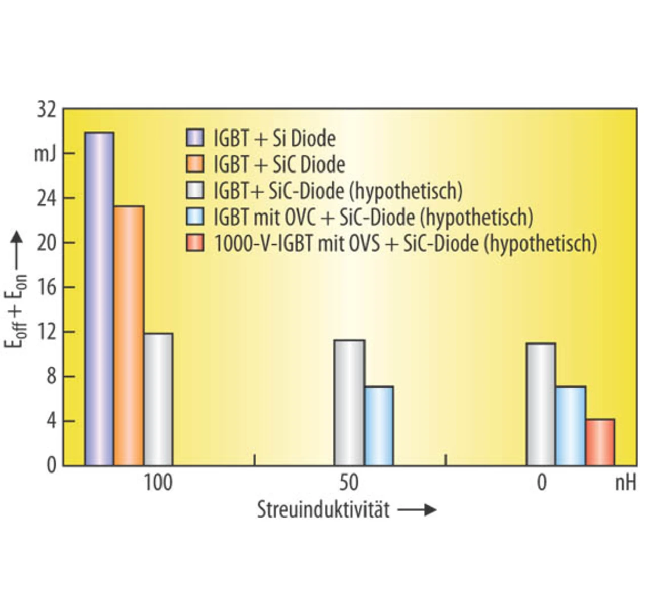 In Bild 10 ist ein simulierter Vergleich der Schaltverluste von heutigen Standard-Bauelementen (IGBT und Si-Diode) mit einem Baustein-Paar mit SiC-Diode dargestellt, basierend auf einem 1200-V/150-A-IGBT und einer Gesamt-Streuinduktivität von 100 nH - entsprechend der oben genannten 25 nH für einen Strom von 600 A. Der um 20 % geringere Gesamtverlust ist hier nur auf niedrigere Einschaltverluste aufgrund der fehlenden Reverse-Recovery-Ladung in der SiC-Diode zurückzuführen (siehe auch [8]).