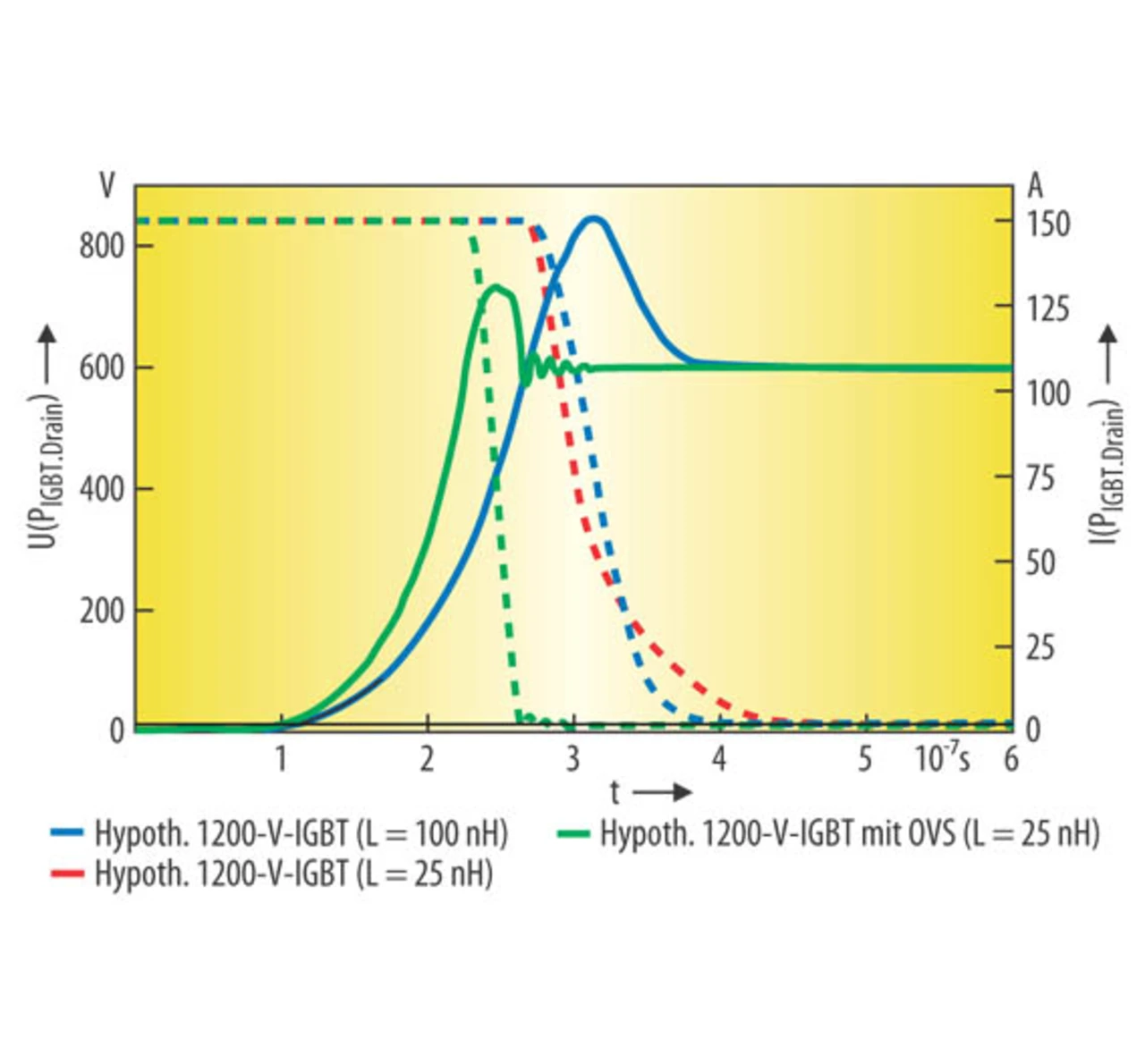 Der Bedarf an Modulen und Systemkonfigurationen mit weit niedrigerer Impedanz steigt mit jeder neuen Generation von Si-Bauelementen aller Spannungsklassen. Natürlich ist der Zwang zu niederinduktiven Modul- und System-Konzepten umso höher, solange der Bedarf an Bauteilen mit niedriger Spannung bei gleichzeitig hohen Strömen da ist. Dies ist besonders bei Hybrid- und Elektrofahrzeugen mit Wechselrichtern der Fall, die mit Zwischenkreisspannungen bis 450 V und maximalen Strömen von 600 A arbeiten. Eine Sperrspannung von 600 V wird sehr schnell erreicht, wenn hier nicht sowohl das Modul als auch das Gesamtsystem sorgfältig mit Streuinduktivitäten unter 25 nH konzipiert wurden - 600 A in 100 ns zu schalten bedeutet immer noch Spitzen von 150 V. Auch hier können höhere Sperrspannungsklassen und/oder langsameres Schalten ein Ausweg sein, aber dies führt zu erhöhten statischen und dynamischen Verlusten.