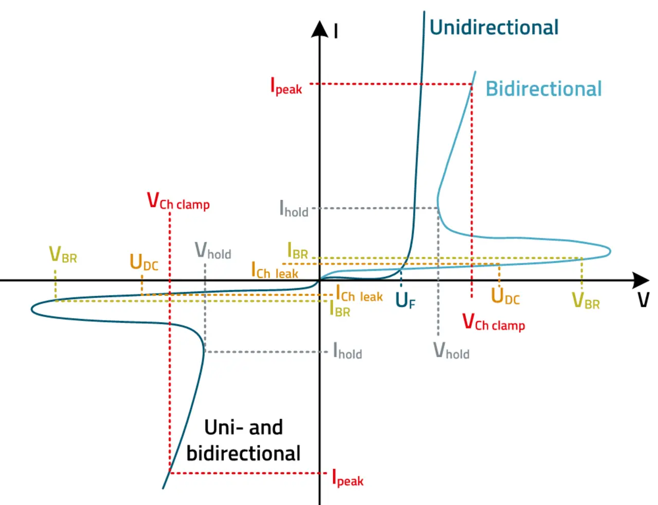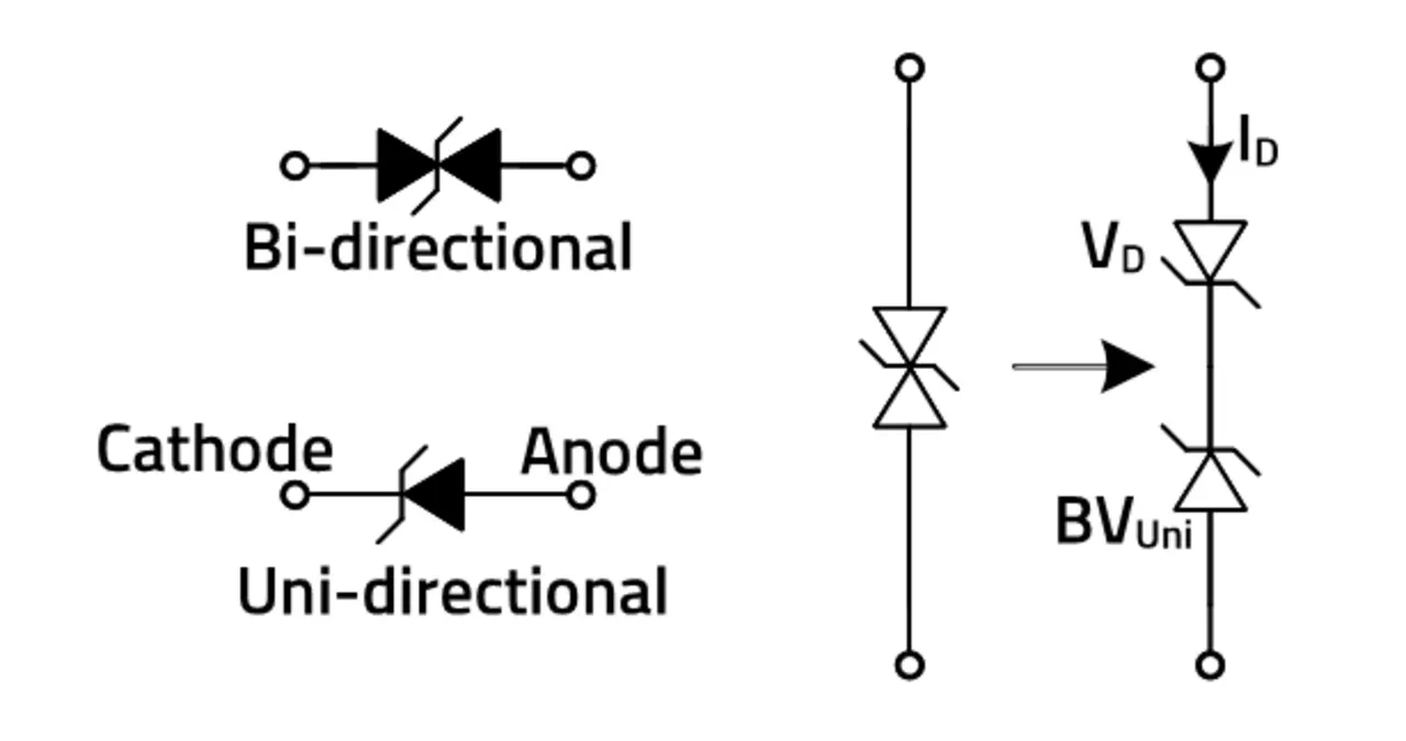 Es gibt sie entweder in unidirektionaler oder bidirektionaler Ausführung. Unidirektionale TVS-Dioden sperren bis zur Nennspannung in einer Richtung und verhalten sich in der anderen Richtung wie eine normale Diode in Durchlassrichtung. Bidirektionale TVS-Dioden sperren bis zur Nennspannung in beiden Richtungen (gut zum Schutz vor Wechselströmen). Unidirektionale TVS-Dioden weisen eine viel kürzere Einschaltzeit als ihre bidirektionalen Gegenstücke (beispielsweise 5 ps im Vergleich zu 5 ns) auf.