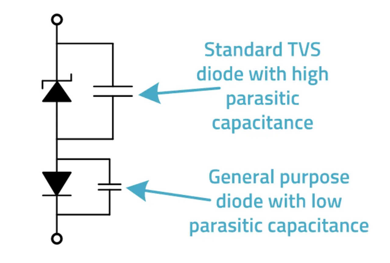 Die Kapazität der TVS-Diode ist durch die konventionellen Dioden vor der Schaltung praktisch „versteckt“. Die Dioden müssen dem Transientenstrom standhalten, und benötigen eine Durchbruchspannung in Sperrrichtung, die größer ist als die Durchbruchspannung der TVS-Diode.