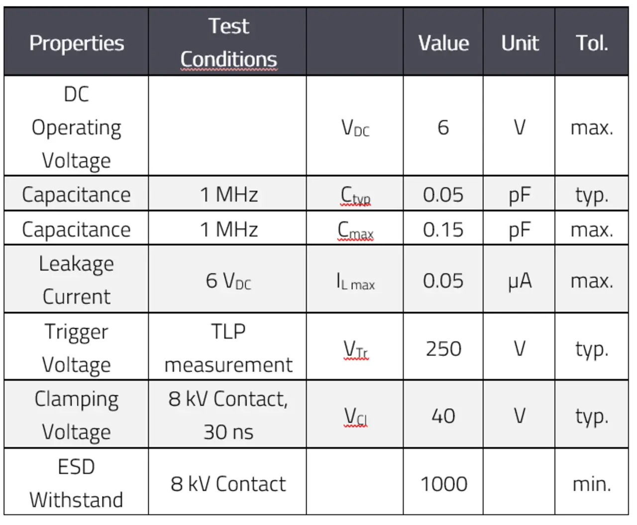 Ein spannungsbegrenzendes Bauelement muss Schutz vor transienten Ereignissen bieten, ohne den gewünschten Betrieb der Schaltung zu beeinträchtigen. Dies kann eine Herausforderung sein, da die Parameter oft gegeneinanderstehen. Eine TVS-Diode für hochfrequente Signalschnittstellen sollte eine geringe Kapazität aufweisen, um eine Signalbeeinflussung durch kapazitive Last zu vermeiden. Jedoch hängt die Fähigkeit eines Bauelements, Energie zu absorbieren, von der Größe der Sperrschicht ab.