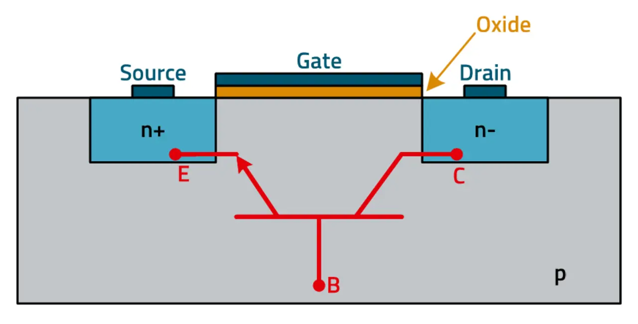 Jeder NMOS-FET enthält aufgrund der Konfiguration des dotierten Materials einen parasitären bipolaren Sperrschichttransistor (BJT). Im normalen Betrieb eines NMOS-Bauelements kommt der parasitäre BJT nicht zum Tragen. Wie in Bild 4 dargestellt, hat der BJT die Source als Emitter und den Drain als Kollektor, und das p-Substrat darunter kann unter den richtigen Bedingungen als die Basis des BJT dienen.