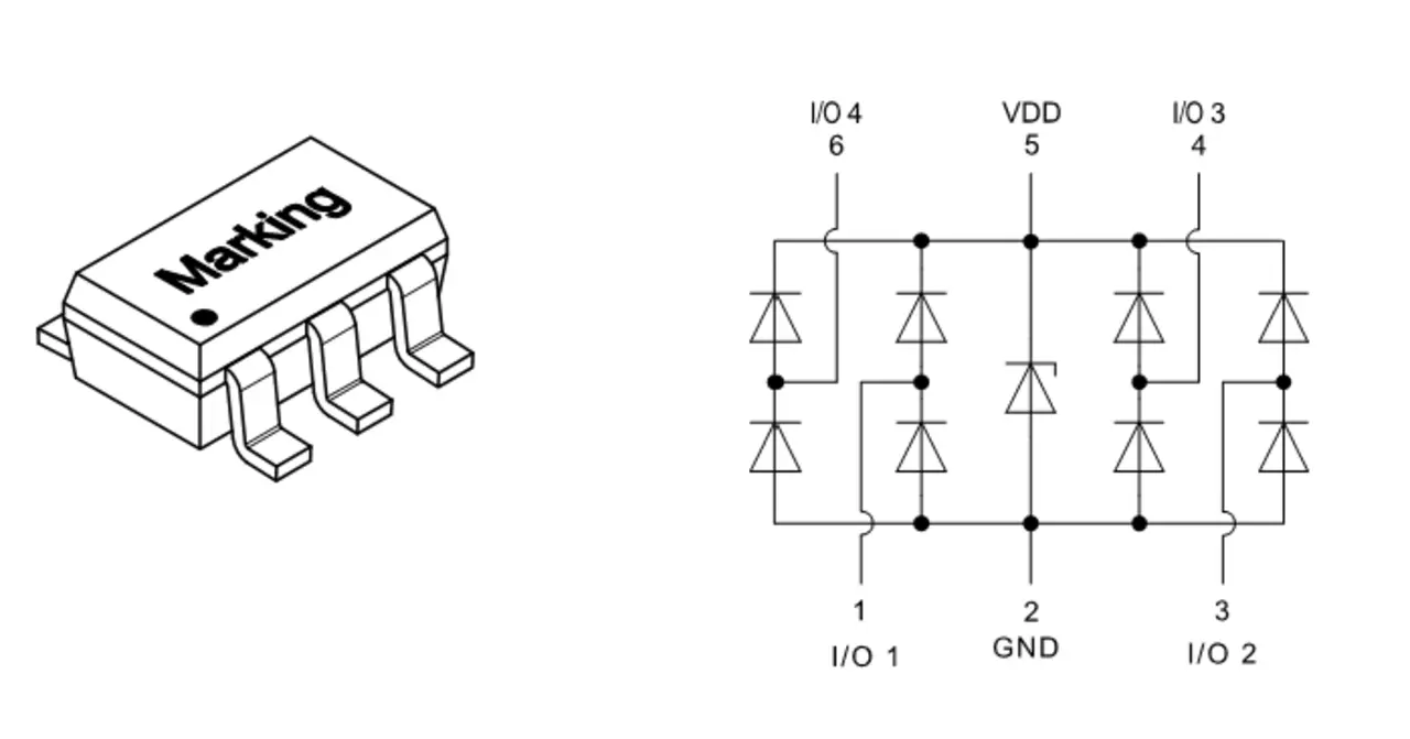 Je größer die Sperrschicht ist, desto mehr Energie kann sie absorbieren. Der Nachteil ist, dass mit zunehmender Größe der Sperrschicht auch die Kapazität des Bauelements zunimmt. Wie schon gezeigt, ist eine gängige Methode zur Verringerung der effektiven Kapazität der Einsatz einer kapazitätsarmen Diodenschaltung (Bild 3). Um mehrere, symmetrische Signalbusse wie etwa USB 3.1 zu schützen werden mehrere Diodenschaltungen zu einem „Array“ kombiniert (Bild 6).