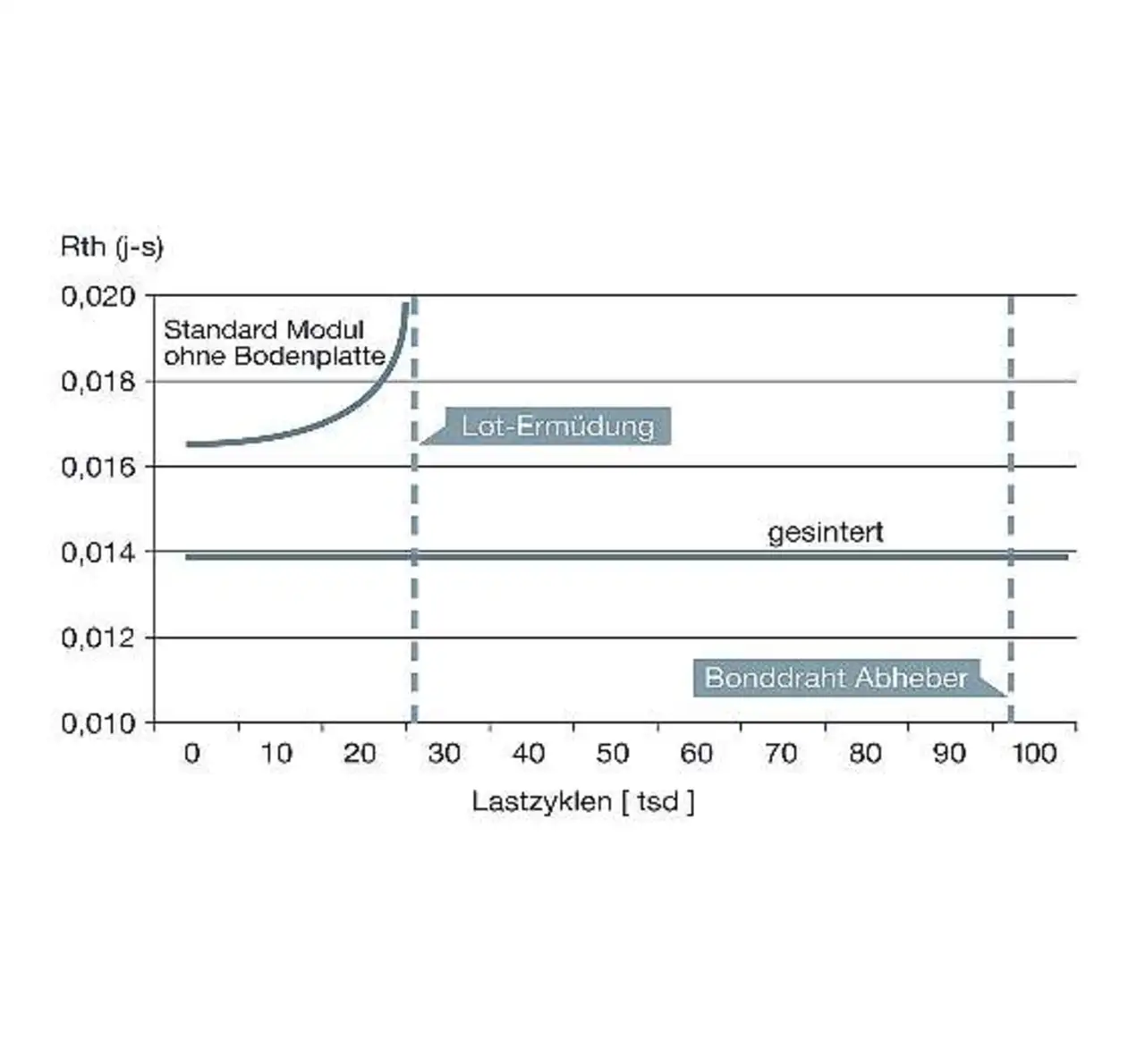 Solche Lastzyklen lassen sich im Labor nachstellen und so die Zuverlässigkeit ermitteln (Bild 2). Während bei einem Modul mit gelöteten Chips mit Zunahme der Lastzyklen der thermische Widerstand Rth durch die Veränderung beziehungsweise Ermüdung des Lots steigt, bleibt dieser bei den gesinterten Chips gleich. Durch die Erhöhung des Rth wird die Sperrschicht immer heißer, und der Chip fällt letztendlich durch thermische Überlast aus.
