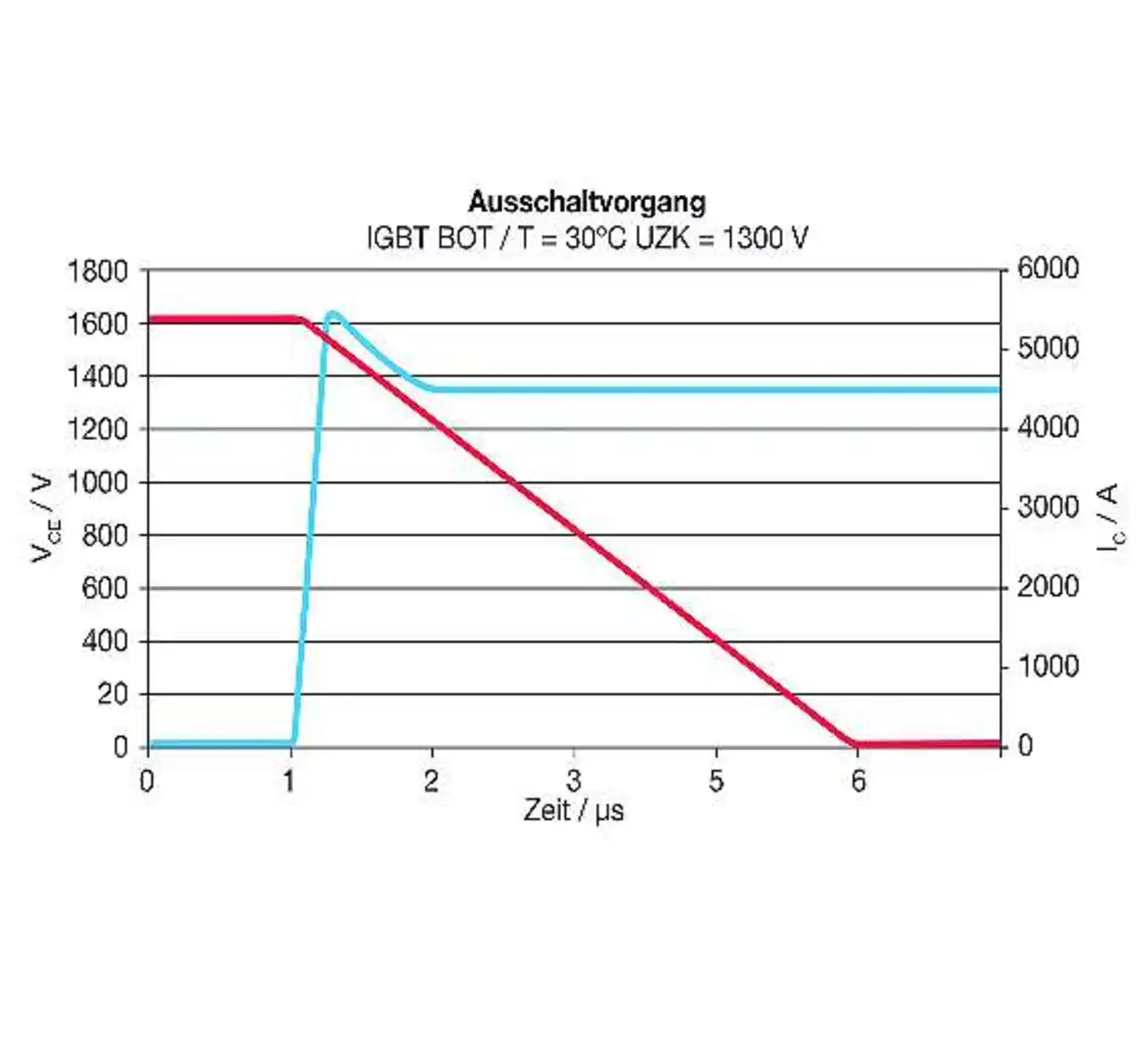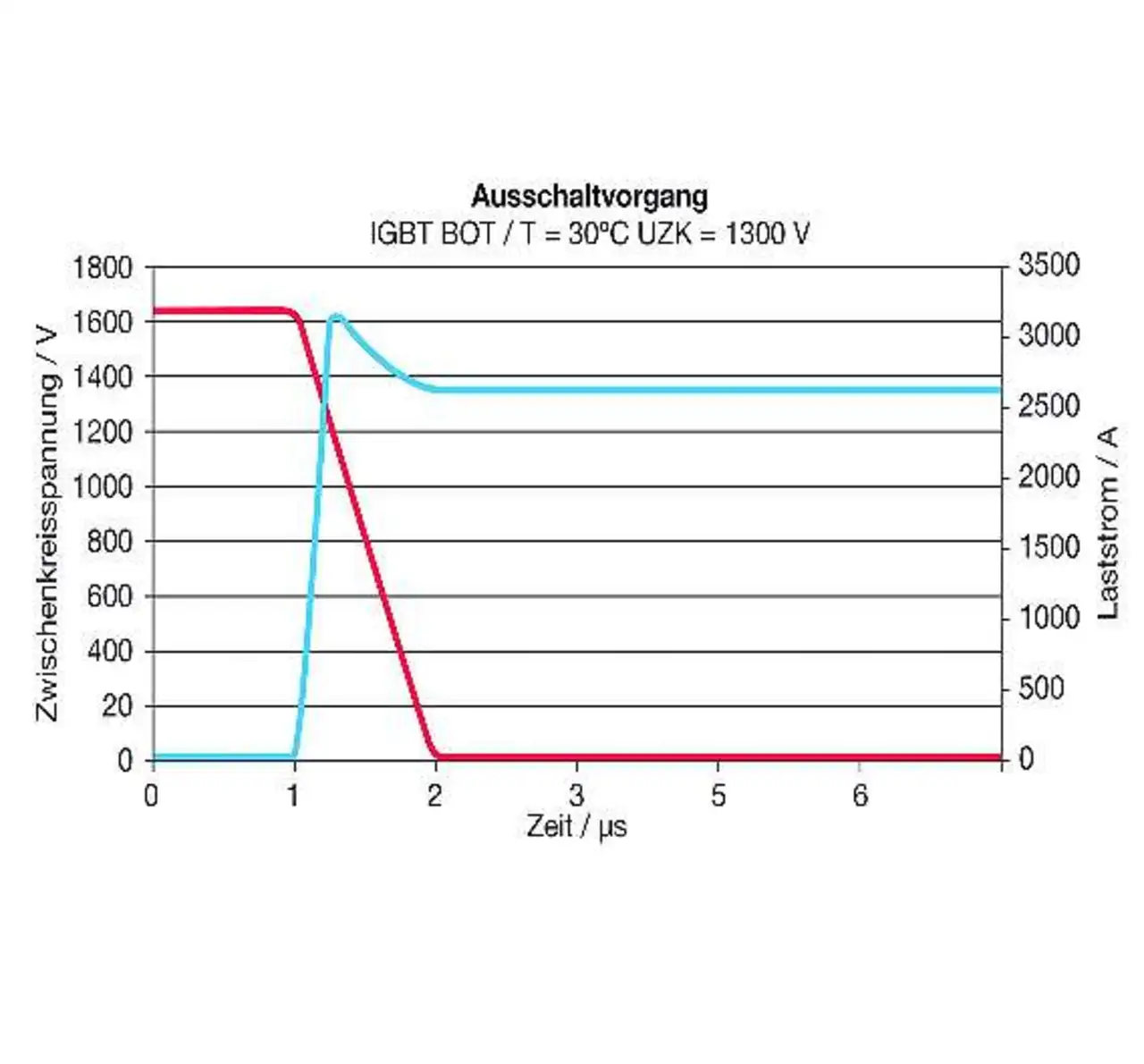 Überspannungen entstehen durch drei Faktoren, denn ∆U = L ∙ di/dt. Der Strom (i) ist durch die Applikation vorgegeben. Die Geschwindigkeit (dt), mit welcher der IGBT abschaltet, wird durch die Treiberelektronik beeinflusst. Durch den Aufbau lassen sich die parasitären Induktivitäten (L) verringern. Bereits bei der Entwicklung des SKiiP3 hat Semikron hierauf sehr viel Wert gelegt; die Kommutierungsinduktivität beträgt hier 6 nH. Bei der SKiiP4-Serie wurde dieser Wert nochmals um 25% auf 4,5 nH verringert. Dies ist der Grund, der es ermöglicht hat, ein IPM mit 3600 A anzubieten.