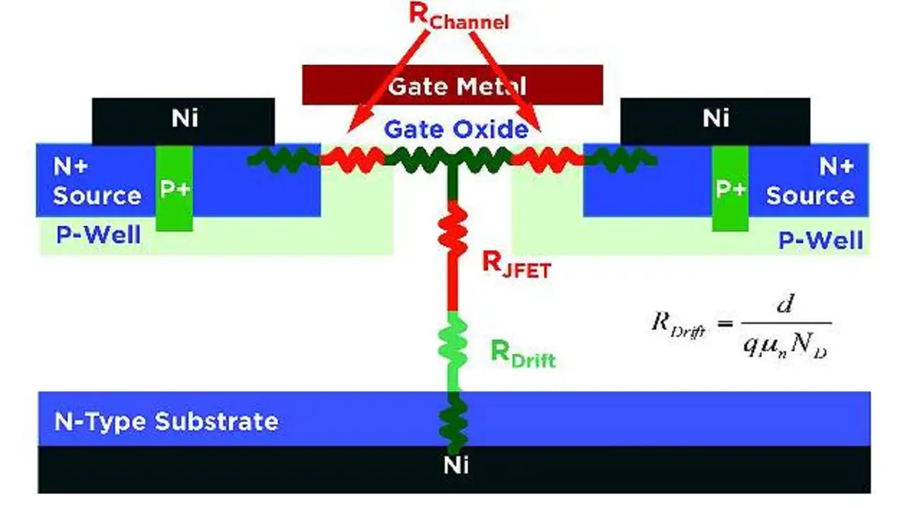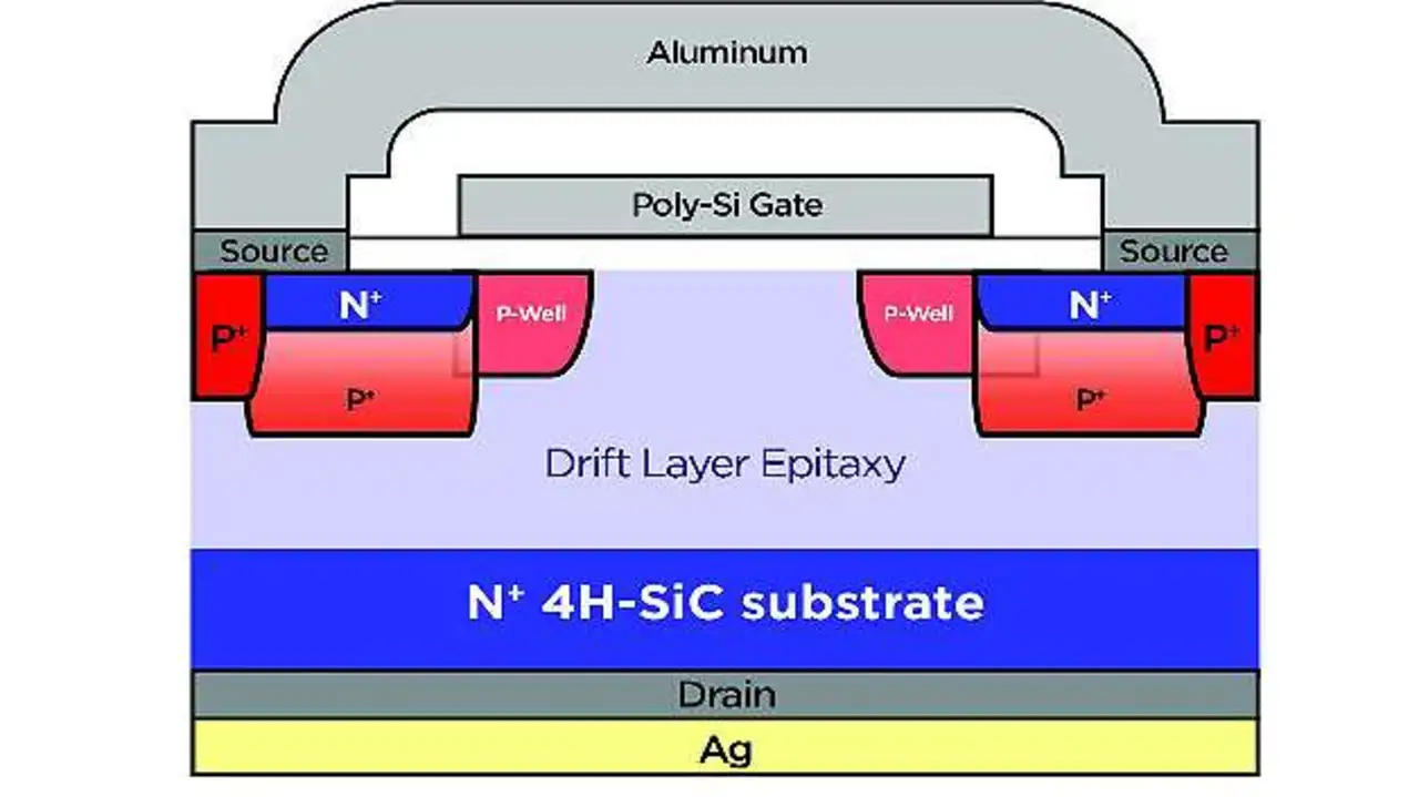Gegenüber Siliziumbausteinen benötigen SiC-MOSFETs nur ein Zehntel der Driftdicke, um eine bestimmte Sperrspannung zu erreichen. Deshalb dominiert der Driftwiderstand den RDS(on)-Wert von Silizium-MOSFETs, sobald die Sperrspannung mehr als ein paar hundert Volt beträgt. Der höhere Widerstand aber macht es notwendig, die Die-Fläche erheblich zu vergrößern, um einen angemessenen Duchlasswiderstand zu erzielen. Insgesamt führt dies dazu, das Silizium-MOSFETs groß und teuer sind und wegen der hohen kapazitiven Verluste nur für begrenzte Schaltfrequenzen eingesetzt werden können.