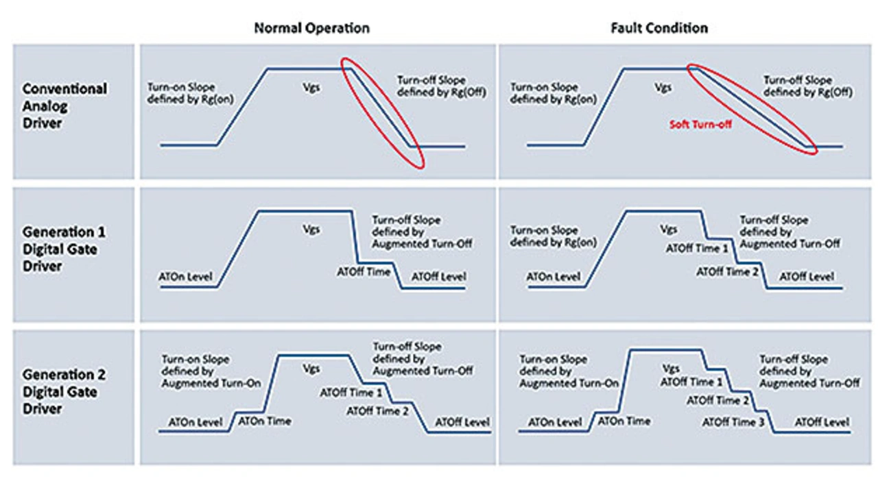 Diese erweiterten Schaltfunktionen werden ständig weiterentwickelt. Die digitale Gate-Ansteuerung bietet jetzt bis zu zwei Steuerschritte für das Einschalten im Vergleich zu einer einzigen Stufe bei herkömmlichen analogen Treibern und bis zu drei Steuerschritte, um sanft auszuschalten. Das Hinzufügen einer vierten Stufe für die Kurzschlusseinstellung bietet die Möglichkeit, den sekundären Effekt der SiC-Schaltgeschwindigkeiten noch präziser zu steuern und Überschwinger, Nachschwingen und Abschaltenergie zu berücksichtigen. Durch diese Funktionen lassen sich schnelleres Schalten sowie granulare und dynamische, mehrstufige Ein-/Ausschaltsteuerung kombinieren, um den steigenden Anforderungen von SiC-Anwendungen zu entsprechen.
