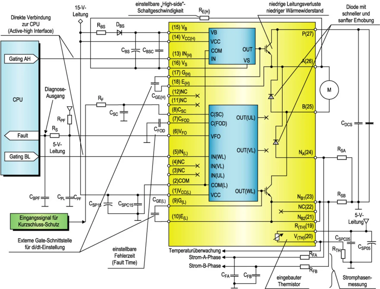 Die Antriebslösung in Bild 1 basiert auf einer diskreten Leistungsstufe. Fairchild bietet zusätzlich hierzu eine Reihe an „Motion-SPM“-Modulen an, deren Vor- und Nachteile im Vergleich zu diskreten Lösungen im Folgenden im Detail analysiert werden.