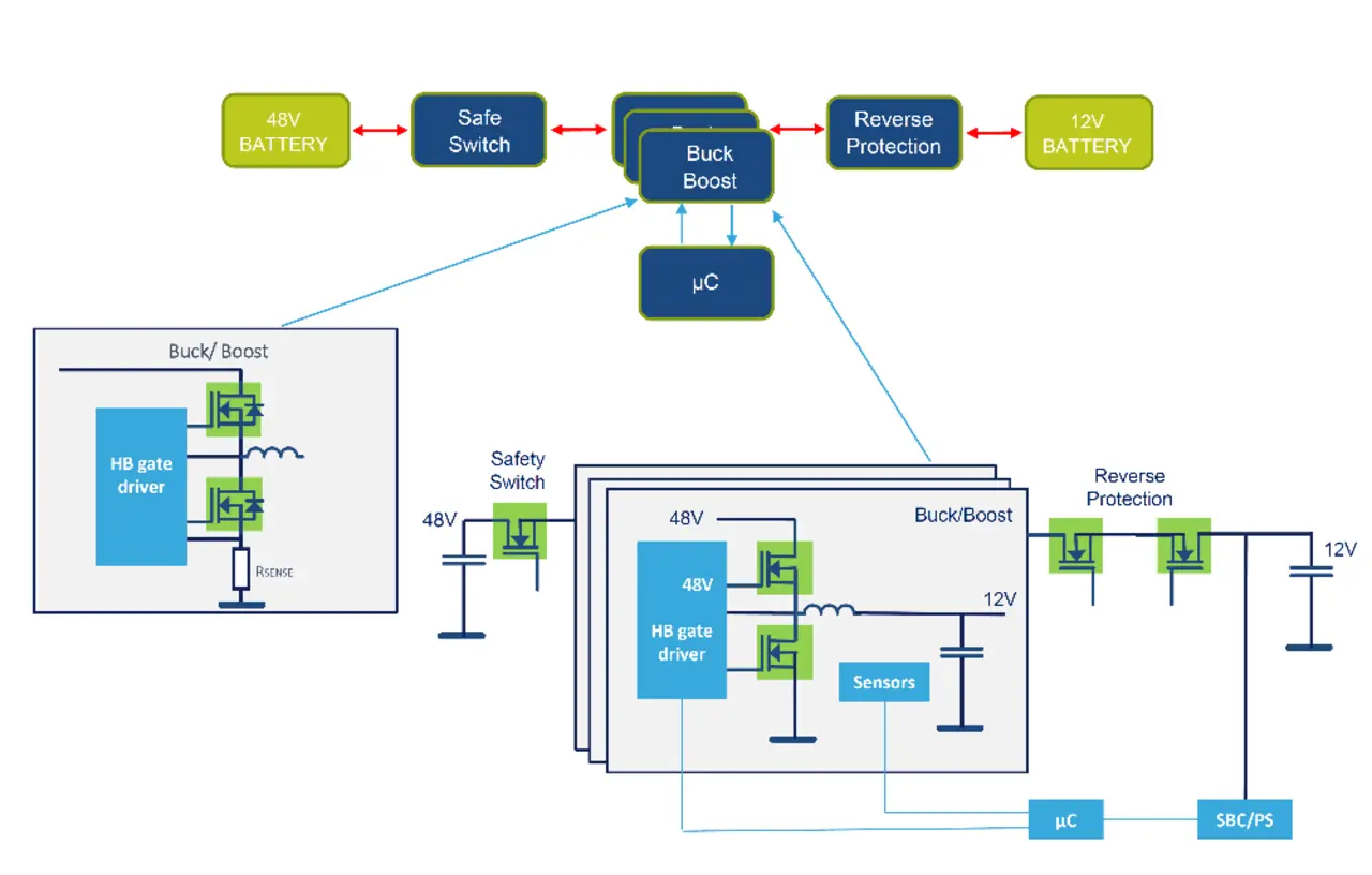 Mildhybrid-Antriebe setzen für eine hohe Leistung fast ausnahmslos auf 48 V. Ein Bestandteil der 48-V-Mildhybrid-Architektur ist ein bidirektionaler Leistungswandler mit einer Leistung von 3,3 kW, der für den Energietransfer zwischen dem Haupt-Bordnetz mit 48 V und dem 12-V-Bordnetz genutzt wird (Bild 2).