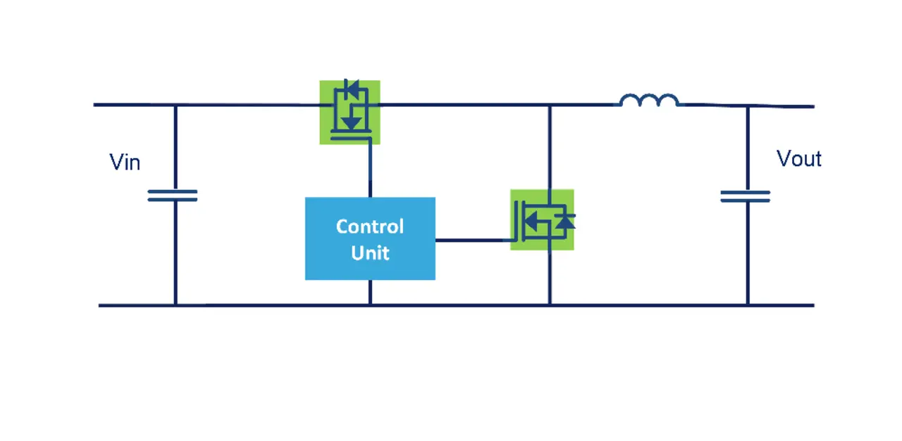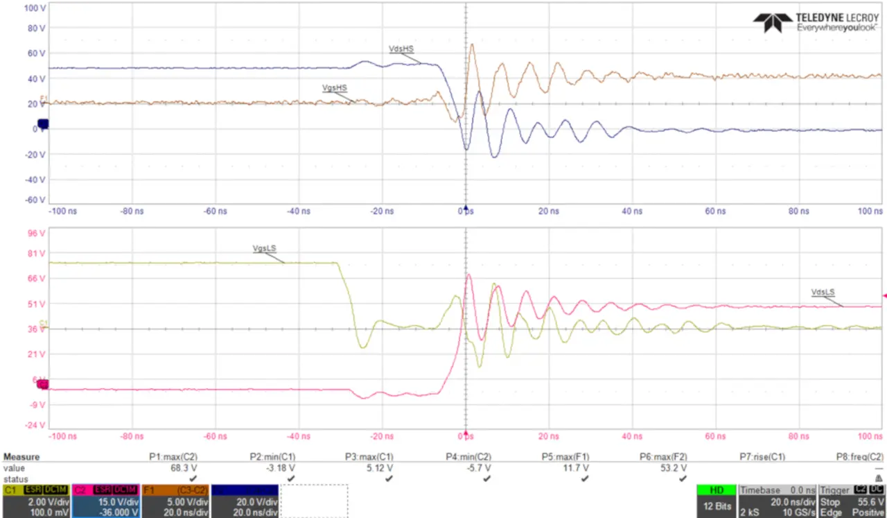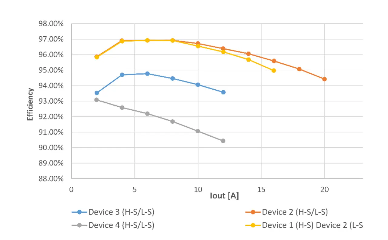 Im Test wurden beide 100-V-Silizium-Leistungs-MOSFETs oben (High Side) und unten (Low Side) eingesetzt (Bild 3), die GaN-HEMTs dagegen wurden wie folgt verwendet: