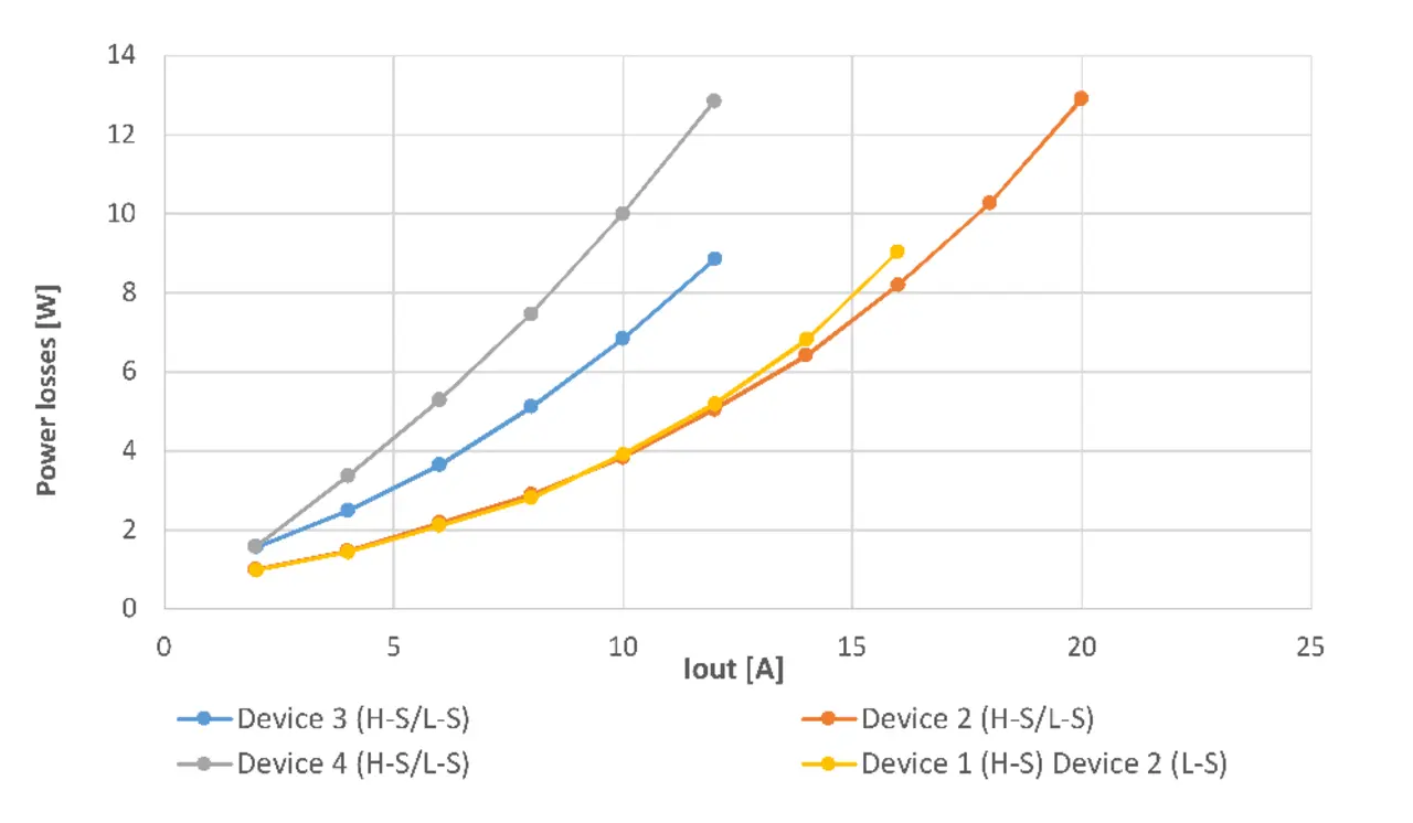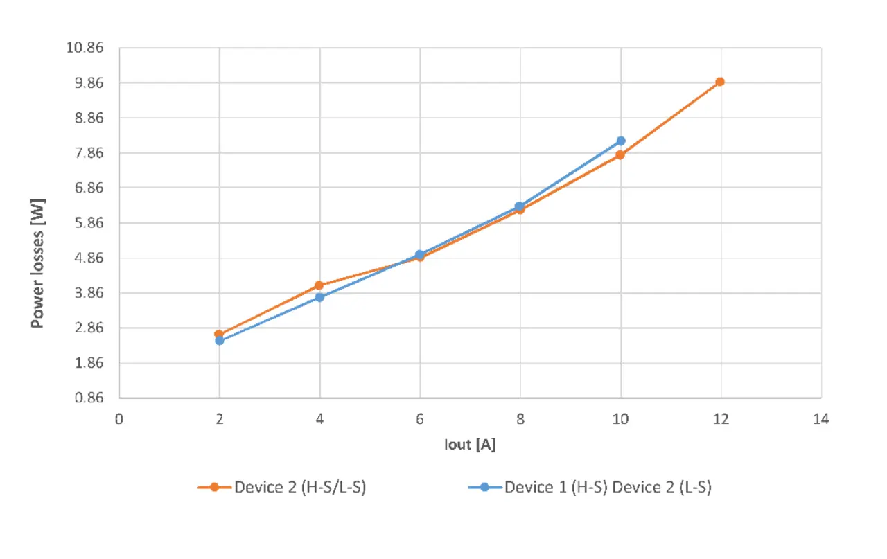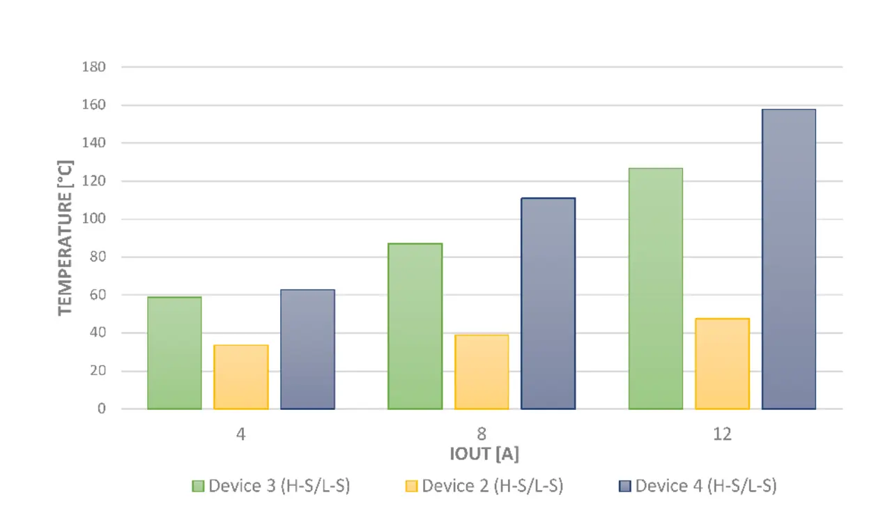 Die vorteilhaften Wirkungsgradresultate der GaN-Transistoren spiegeln sich auch in den Temperaturmessungen am oberen Schalttransistor wider, die hauptsächlich von den Schaltverlusten beeinflusst werden (Bild 6).
