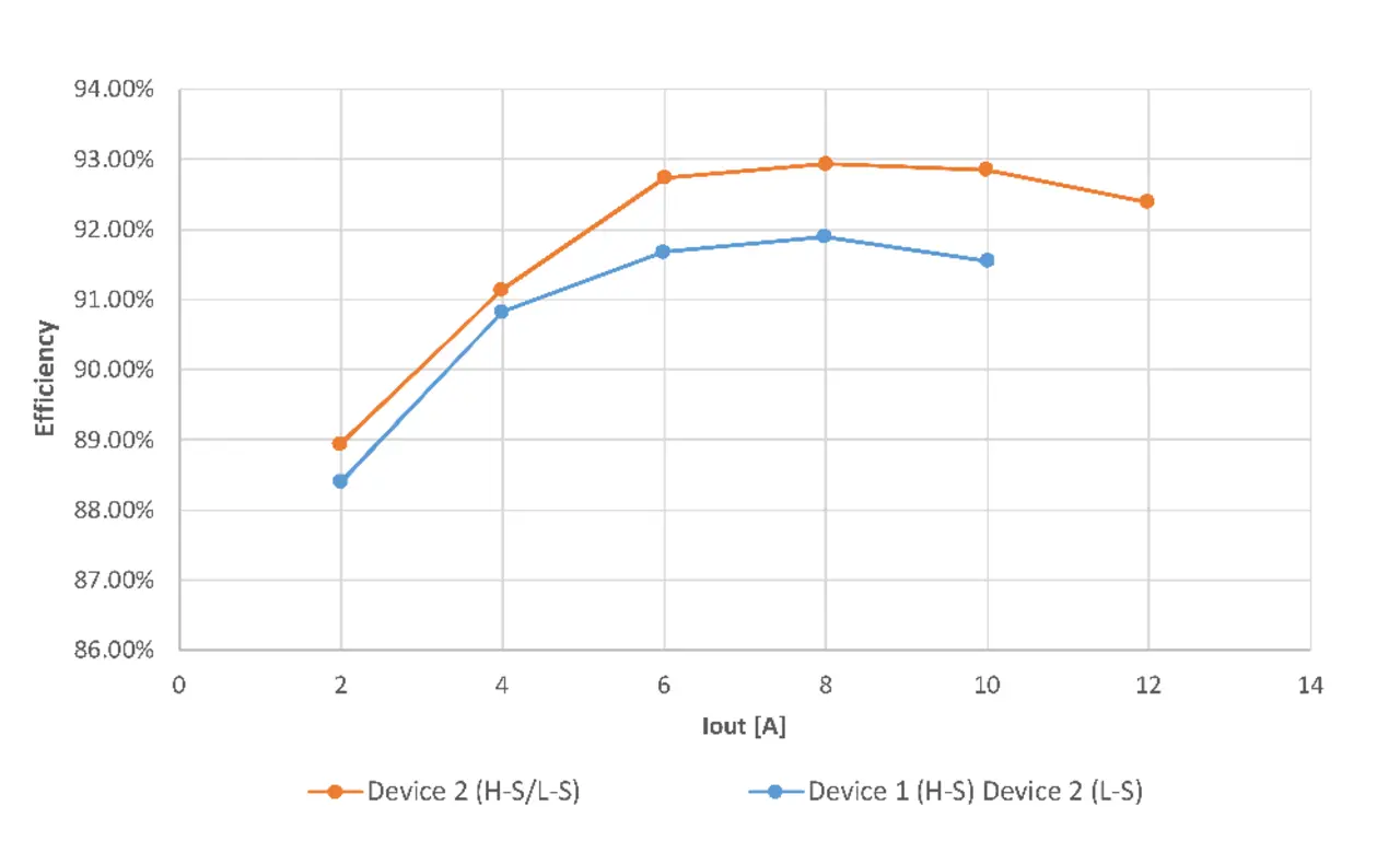 Aus den Messungen und Ergebnissen wird ersichtlich, dass die GaN-Transistoren selbst bei dieser hohen Schaltfrequenz auf einen maximalen Wirkungsgrad von 93 % brachten.