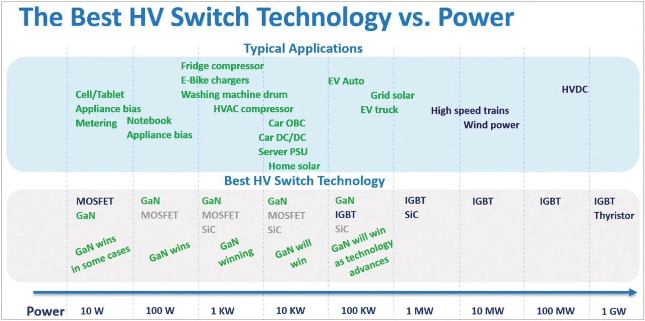 Immer mehr dieser 1- bis 10-kW-Anwendungen, die bisher MOSFETs und SiC vorbehalten waren, können in Zukunft durch GaN abgedeckt werden, und das ist noch nicht alles. Derzeit liegt die Obergrenze für GaN bei etwa 7 bis 10 kW. Um den Bedarf des Markts an EV-Wechselrichtern zu decken – die größte Einzelanwendung für Leistungs-ICs –, reicht das noch nicht aus. Es braucht aber nur einen weiteren Faktor 10, um auf EV-Leistungsniveaus von einigen 100 kW zu kommen, und der Faktor 10 ist im High-Tech-Bereich nur eine Frage von wenigen Jahren. Es gibt keine wesentlichen Einschränkungen, keine physikalischen Grenzen. Es geht nicht um Erfindungsgabe oder Inspiration, sondern schlichtweg um Entwicklung.