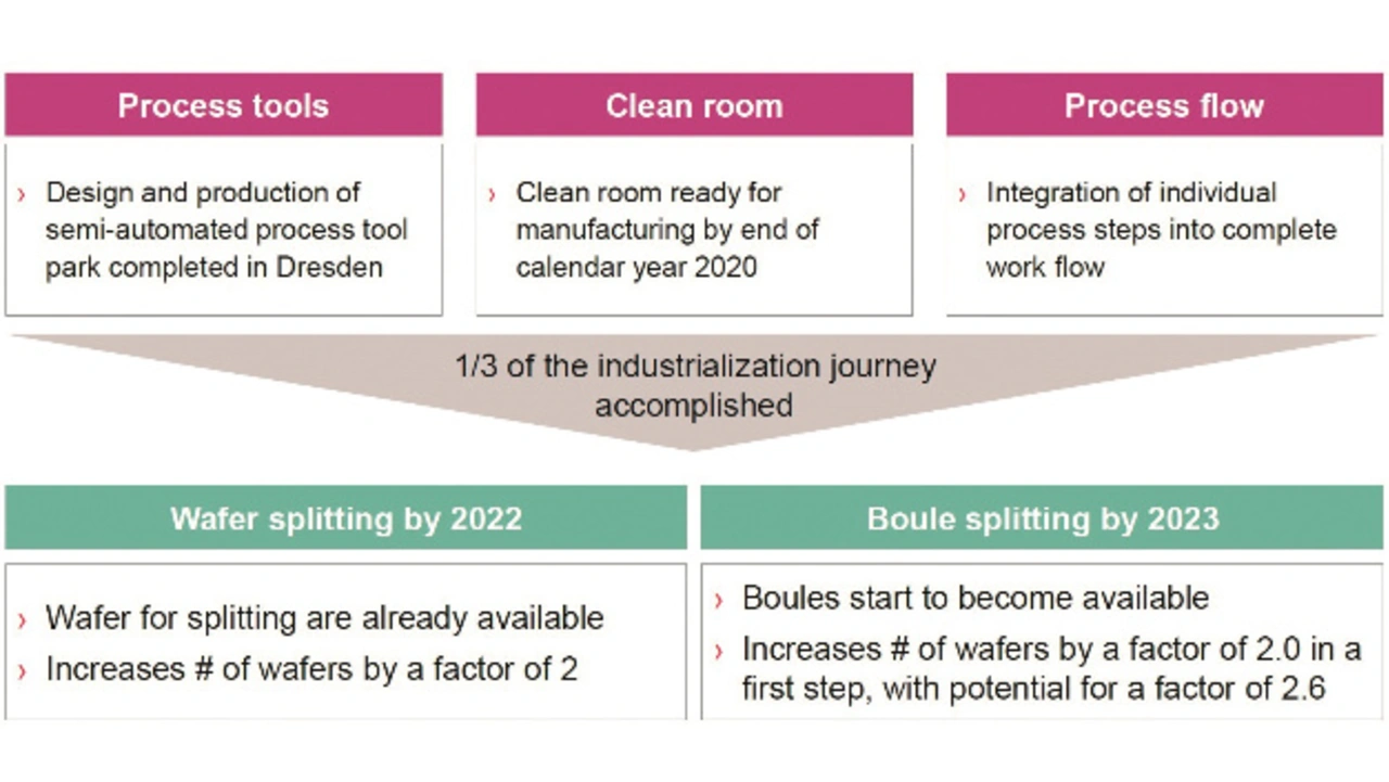 Friedrichs: Wir gehen davon aus, dass das sogenannte Twinning bis 2022 einsatzbereit sein wird. Mit Twinning meine ich, dass ein bereits prozessierter Standard-SiC-Wafer in zwei dünnere geteilt wird. Die untere Scheibe kann so ebenfalls prozessiert werden. Aufgrund einiger Entwicklungen auf dem Rohstoffmarkt erwarten wir, dass in naher Zukunft auch die sogenannten Boules für den Split verfügbar werden.