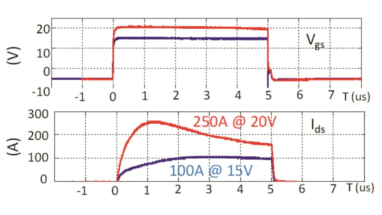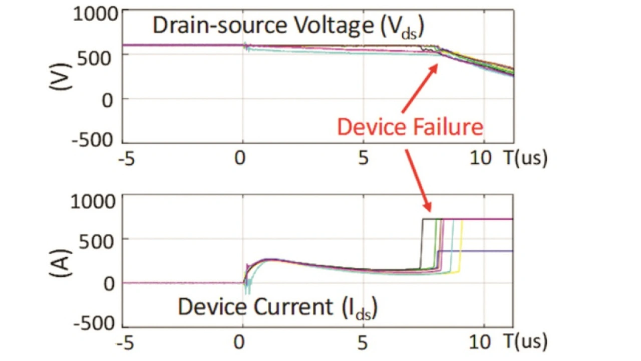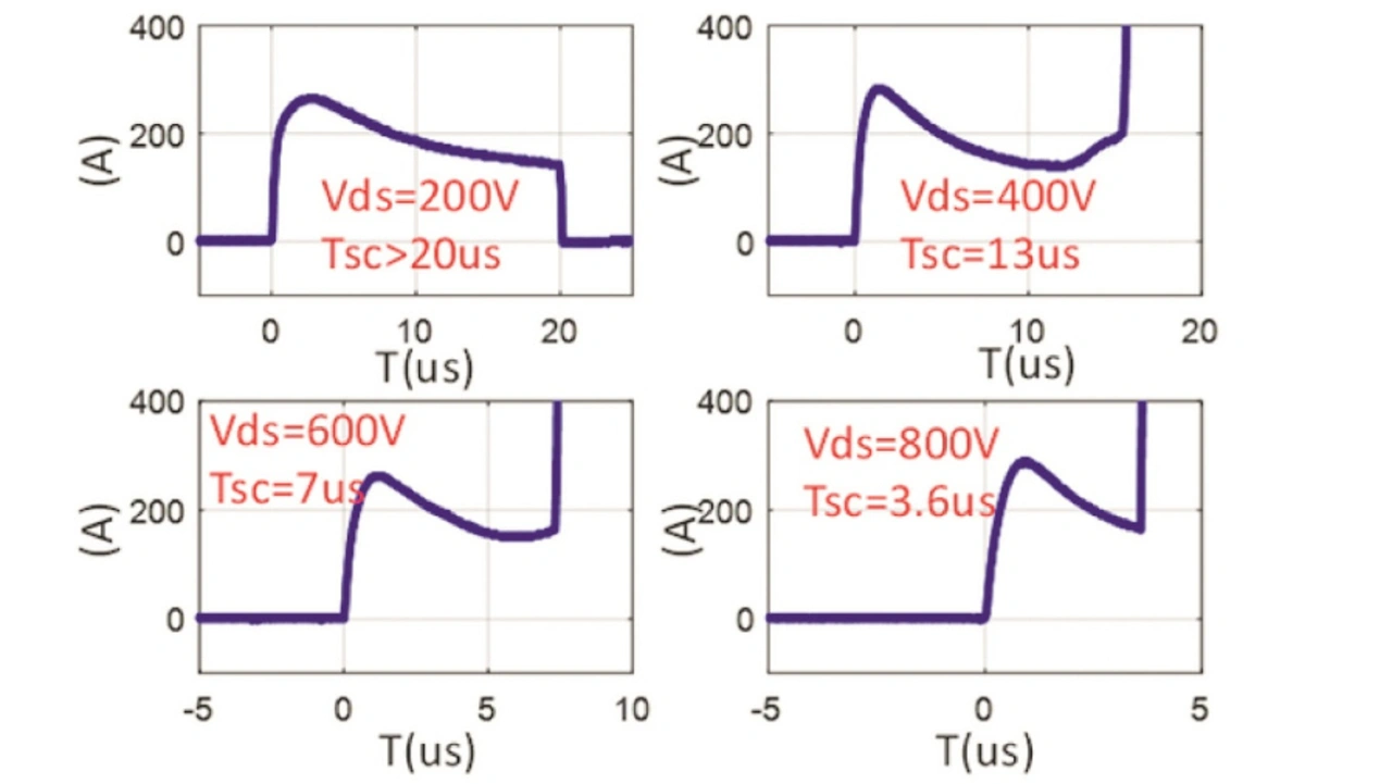 Siliziumkarbid-MOSFETs (SiC) sind hinsichtlich ihrer Chipfläche sehr viel kleiner als äquivalente Silizium-IGBTs. Somit ist die Stromdichte im Kurzschlussfall bei ihnen etwa fünf- bis zehnmal höher, und die Wärmekapazität ist wesentlich niedriger. Dadurch steigt die Temperatur im Chip schneller an und begrenzt die Kurzschlussfestigkeit von SiC-MOSFETs.