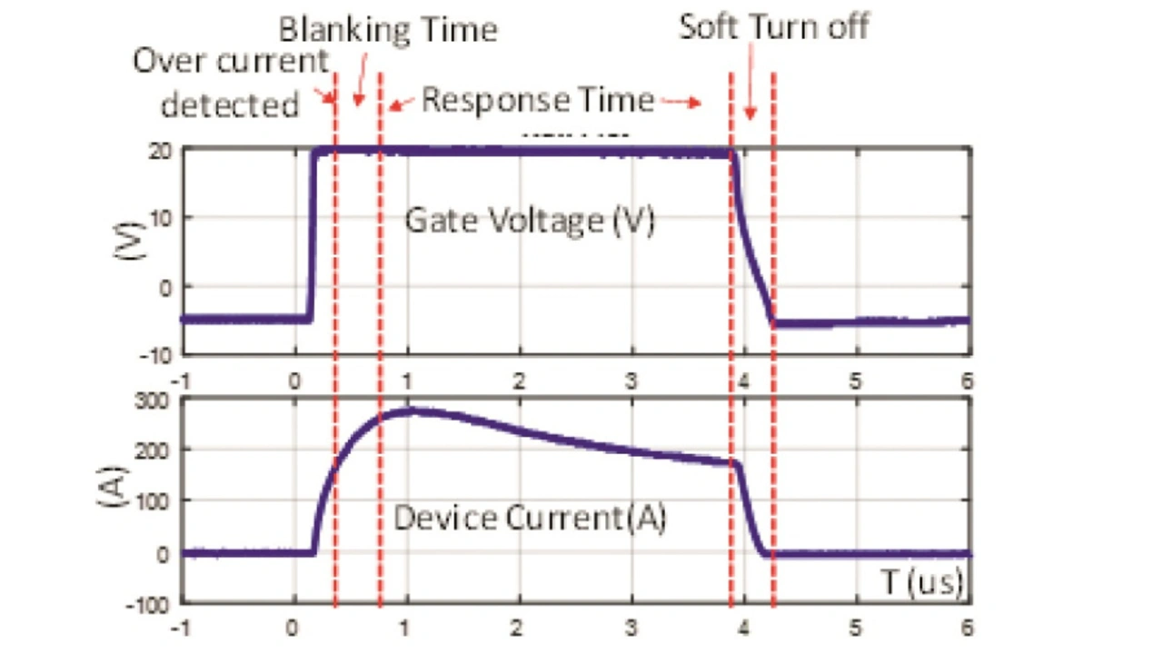 Aufgrund der hohen Schaltgeschwindigkeiten des SiC-MOSFETs und der erforderlichen optimierten Anordnung der Leistungskreise ist die Zeit, die Spannung und Strom im Bauteil benötigen, um nach einem transienten Ereignis den stationären Zustand zu erreichen, viel kürzer als bei einem IGBT. Daher sollte auch die erforderliche Austastzeit (Blanking Time) für die DESAT-Funktionen bei SiC-basierten Designs deutlich kürzer sein. Zum Schutz von SiC-MOSFETs wird in der Regel ein CB von weniger als 100 pF gewählt und die Austastzeit kann bis zu 200 ns betragen, um die Gesamtreaktionszeit des Treiber-ICs zu reduzieren.