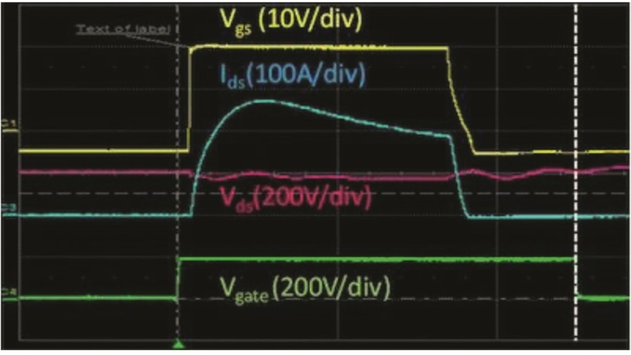 Abschließend wurden der SiC-MOSFET und der Gate-Treiber-IC mit der längsten Ansprechzeit gemeinsam unter Kurzschlussbedingungen sowohl als Einzelschalter als auch in einer Halbbrückenkonfiguration getestet. In der Halbbrückenkonfiguration blieb der obere Transistor während der gesamten Transiente eingeschaltet, während der untere Schalter von einem Gate-Treiber mit DESAT-Erkennung angesteuert wurde.