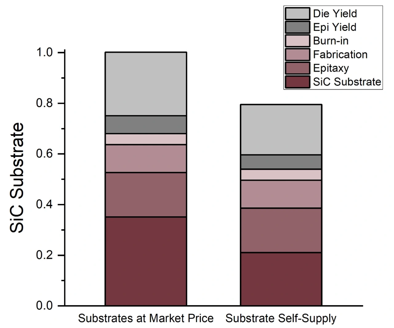 Bild 1 schlüsselt die Gesamtkosten für einen SiC-MOSFET-Die auf, wobei die Ausbeute von einem handelsüblichen MOSFET-Chip mit 1200 V/100 A aus dem Jahr 2021 stammt, hergestellt auf einem 150-mm-Substrat. Die beiden Säulen stehen für zwei unterschiedliche Modelle der Versorgung mit Substraten: zum einen die Unternehmen, die ihre Substrate zu Marktpreisen einkaufen müssen (links), zum anderen denjenigen, die vertikal integriert sind und sich daher selbst mit Substraten zu Selbstkosten eindecken können (rechts).