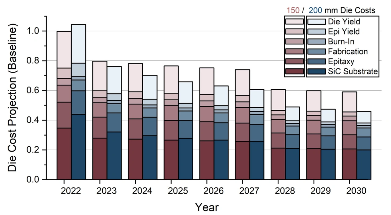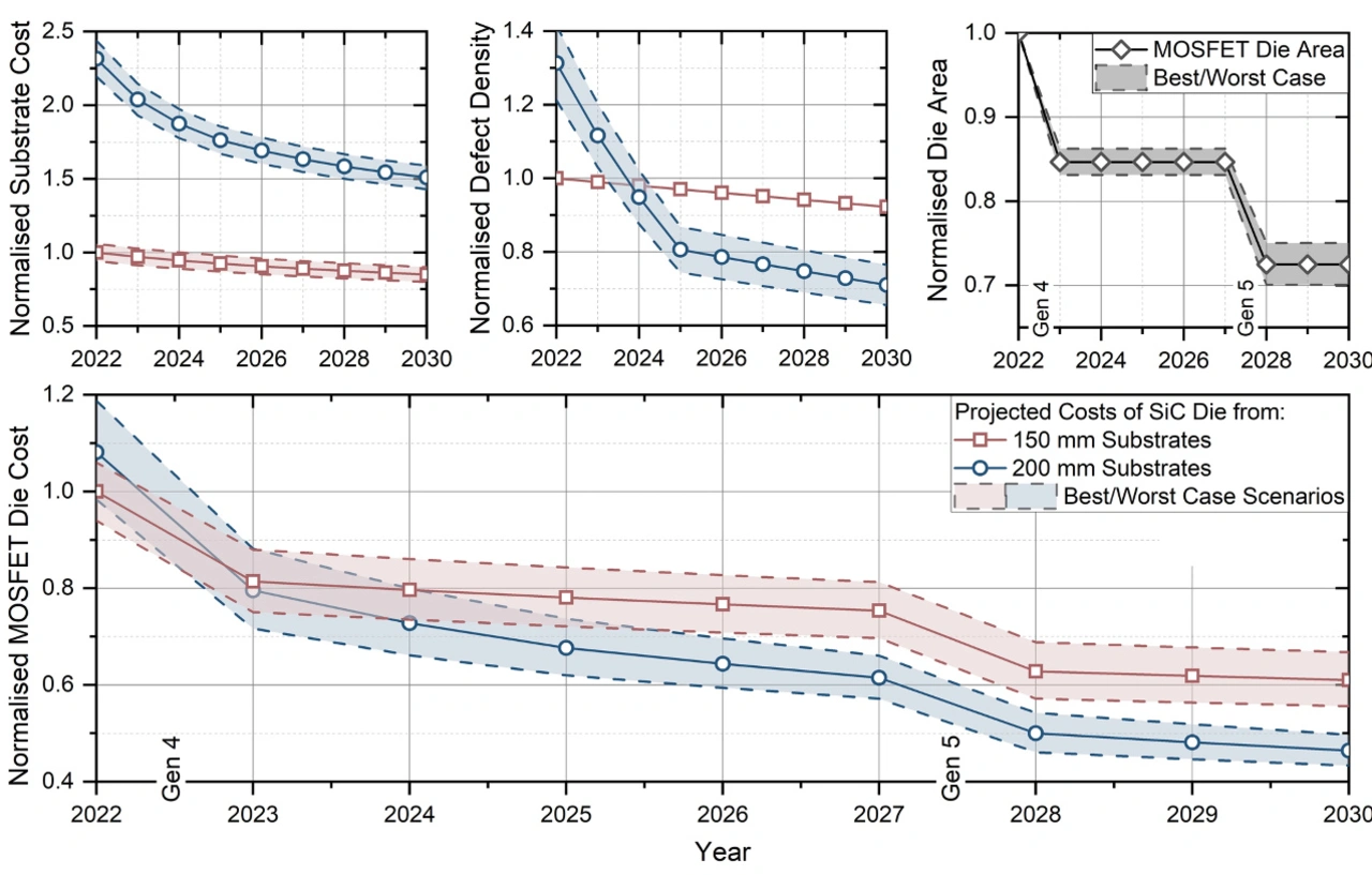 Selbst bei unseren konservativsten Vorhersagen deuten beide Effekte – die Einführung von 200-mm-Substraten und zwei Generationen von verbesserten Bauelementen – darauf hin, dass sich die Kosten für einen SiC-MOSFET bis 2030 gegenüber heute halbieren werden. Bei einem Kostenunterschied um den Faktor 3 zu gleichwertigen Silizium-IGBTs wäre dies eine positive Entwicklung.