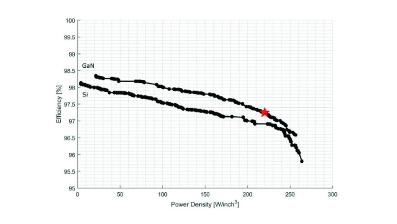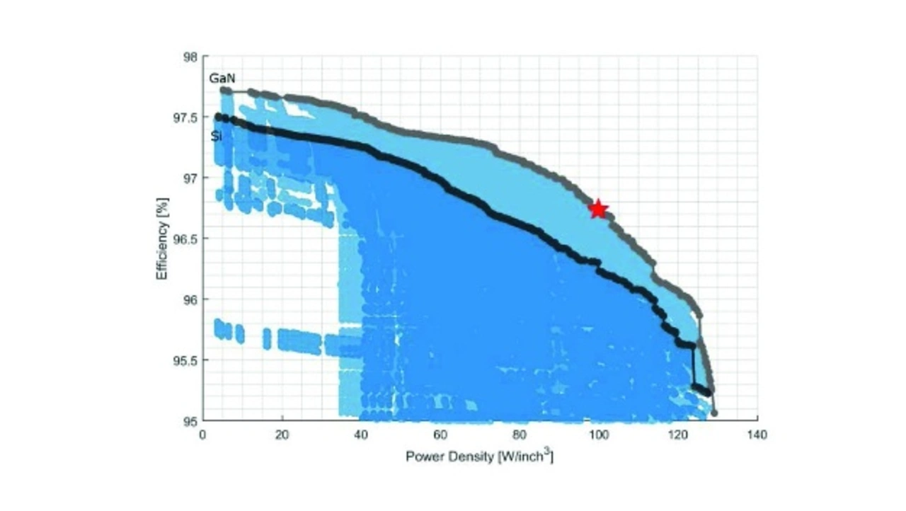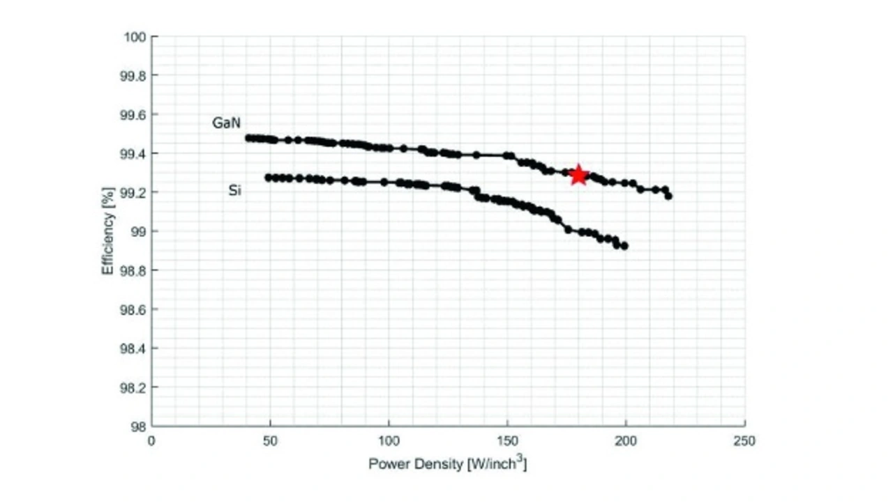 Eine Analyse dieser Designs zeigt, dass der TCM-Betrieb einen kleinen Vorteil gegenüber dem nichtlückenden Betrieb (CCM) speziell im Bereich höchster Leistungsdichte hat. In ähnlicher Weise wurde eine LLC-Stufe für Silizium- und GaN-Halbleiter optimiert (Bild 6). Wie man sieht, verbessert GaN den Wirkungsgrad und die Leistungsdichte gleichzeitig.