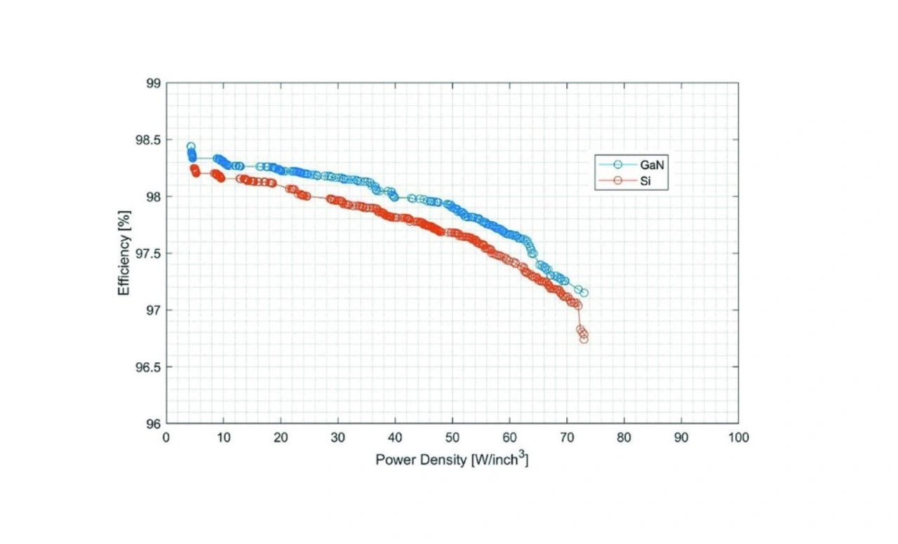 Ein wesentlicher Unterschied der pareto-optimalen Designs mit Silizium- und GaN-Bauelementen im wirtschaftlich interessanten Bereich von 1,83 kW/l (30 W/Zoll³) bis 2,44 kW/l (40 W/Zoll³) liegt in der PFC-Stufe. Der TCM-Betrieb bei Silizium führt dazu, dass der Strom sehr wellig und der Effektivwert des Stroms in der PFC-Drossel hoch ist. Daher müssen zwei HF-Totem-Pole-Schaltungen verschachtelt werden, um die Welligkeit des Eingangsstroms zu reduzieren und das EMV-Filter zu verkleinern. Im Gegensatz dazu ist bei der CCM-geregelten PFC-Stufe bei GaN-Transistoren nur eine HF-Totem-Pole-Schaltung auf Systemebene nötig. Das macht diese Lösung kostengünstiger, beispielsweise lassen sich magnetische Komponenten einsparen.