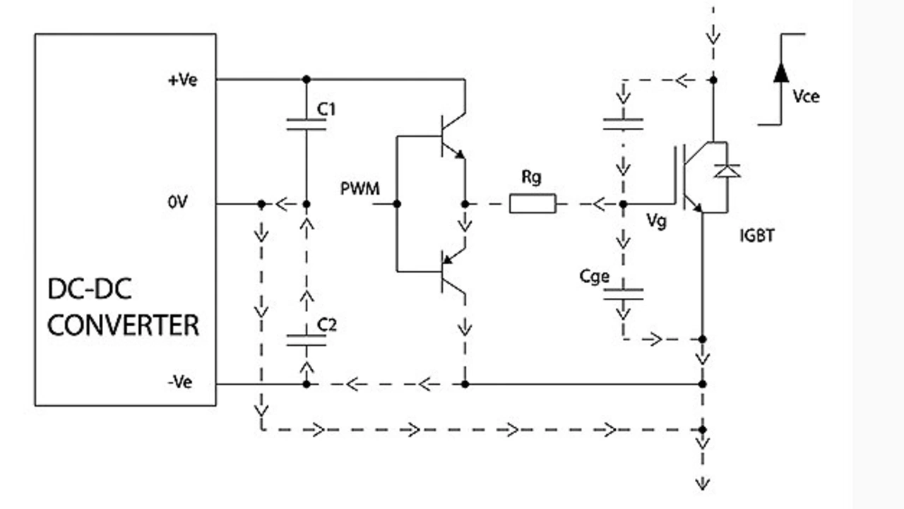 Zusätzlich kann es aufgrund der kapazitiven Kopplung über die Isolationsbarriere zu Problemen kommen. Der Effekt ist vergleichbar mit dem Leckstrom zwischen den Primär- und Sekundärwicklungen eines vollständig isolierten Netztransformators. Daraus ergibt sich die Anforderung, dass die Treiberschaltung und die zugehörigen Stromschienen immun gegen das hohe du/dt des Schaltknotens sein sollten sowie eine sehr geringe Kopplungskapazität aufweisen. Solche Effekte sind auf die sehr schnellen Schaltflanken zurückzuführen, die typischerweise 10 kV/μs und bei den neuesten GaN-Bauelementen sogar bis zu 100 kV/μs betragen. Dieses hohe du/dt verursacht einen transienten Stromfluss durch die Kapazität der Isolationsbarriere des DC-DC-Wandlers.
