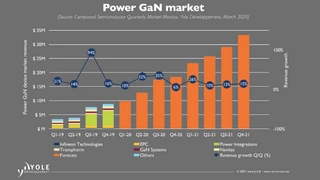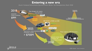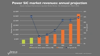 In ihrem Compound Semiconductor Quarterly Market Monitor für das erste Quartal 2020 stellt das Analystenteam von Yole Développement ein Umsatzwachstum von 16 Prozent bei GaN gegenüber dem vierten Quartal 2019. Bis zum Jahr 2025 soll der GaN-Markt über 700 Millionen US-Dollar erreichen, während der SiC-Markt bis dahin über 3 Milliarden US-Dollar schwer sein soll.