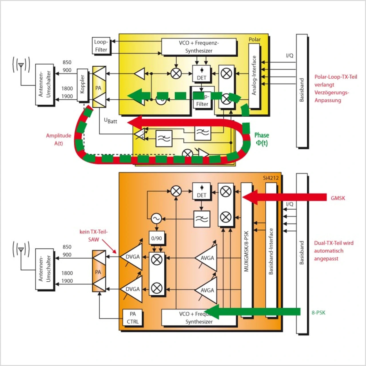 Bild 1 zeigt eine lineare Sender-Architektur im Vergleich zu einer Polar- Sender-Architektur. Im Polar-Loop- Sender gelangt das Signal über getrennte Amplituden- und Phasenrückkopplungs- Zweige zum Leistungsverstärker.