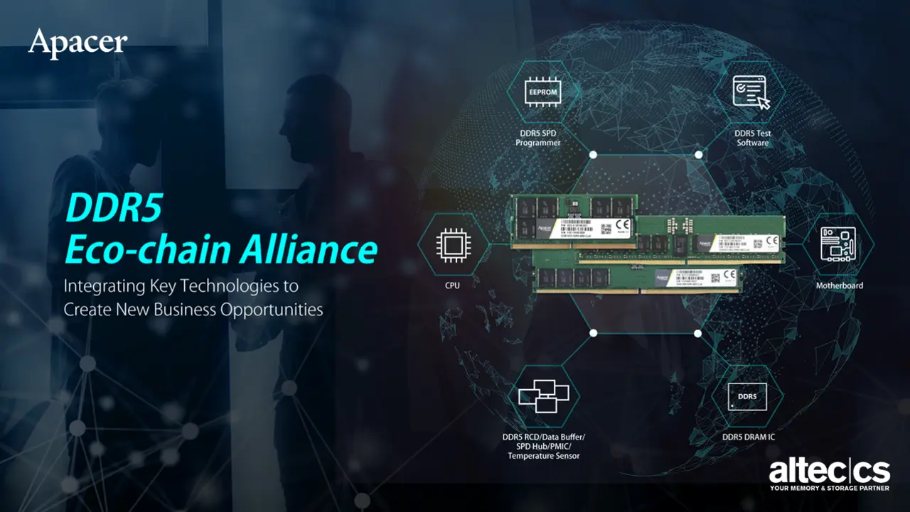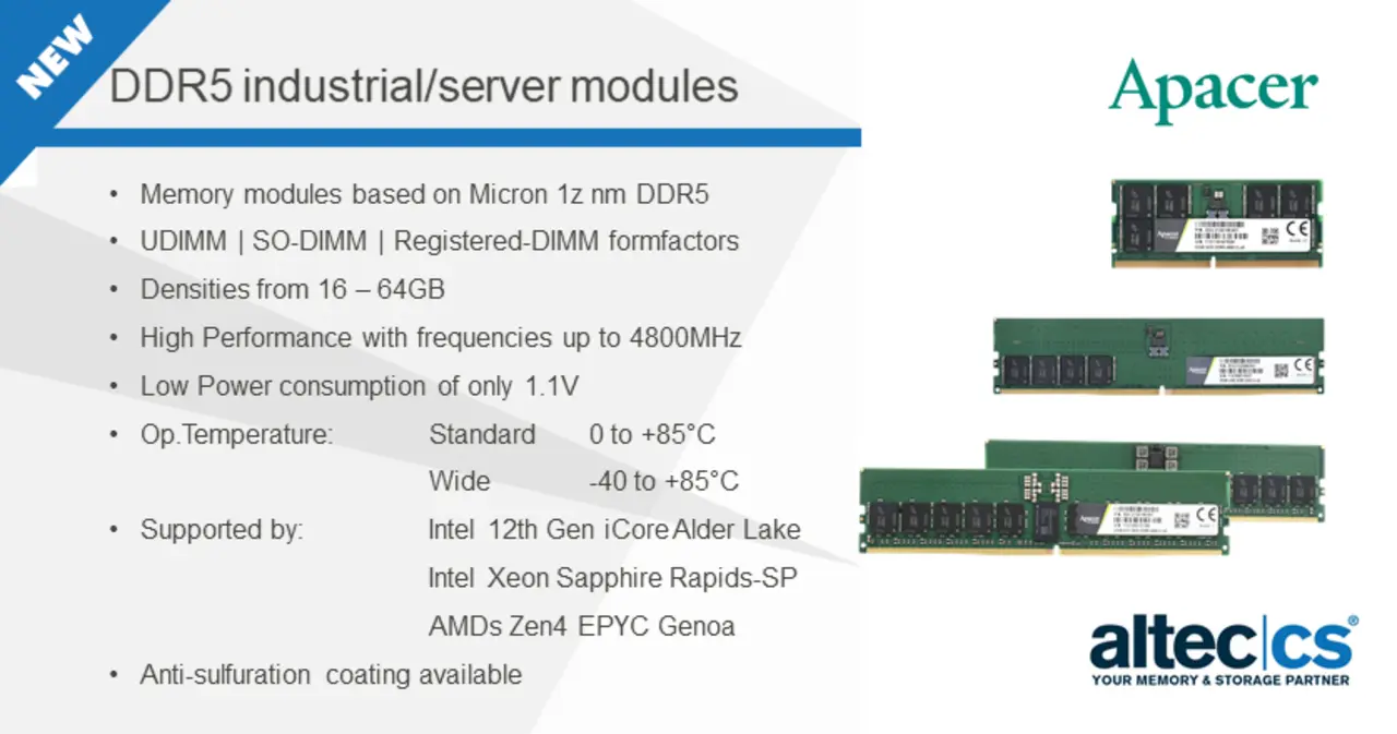 Die altec CS bietet für Hochgeschwindigkeitsanforderungen jetzt die DDR-5 Produktlinie von Apacer. Nach erfolgreichen Jedec Zertifizierungstests und Bildung der „eco-chain-alliance“, punktet DDR5 mit 50% mehr Bandbreite gegenüber DDR4 und 50% höherer Übertragungsrate von 4,8 Gbit/s.