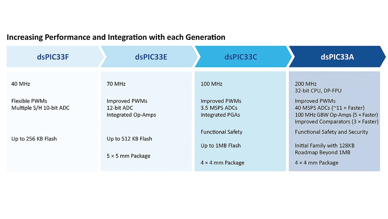 Bild 2 zeigt die Entwicklung der dsPIC DSCs. Die neue Serie dsPIC33A ist die fünfte DSC-Generation von Microchip.