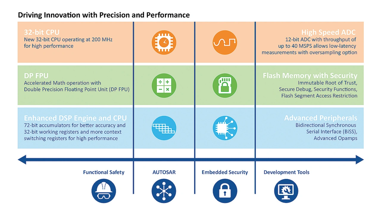 ➔ DP-FPU – die Gleitkommaeinheit ist IEEE 754-2019-konform und unterstützt eine einfache und doppelte Genauigkeit mit einer dedizierten Pipeline, was die Zuverlässigkeit der Software und die Regelkreisgeschwindigkeit verbessert. Gleichzeitig werden Softwarefehler im Zusammenhang mit der Skalierung von Variablen reduziert. Darüber hinaus sind Hardware-basierte Sinus- und Cosinus-Funktionen für eine bessere Motorsteuerung integriert.