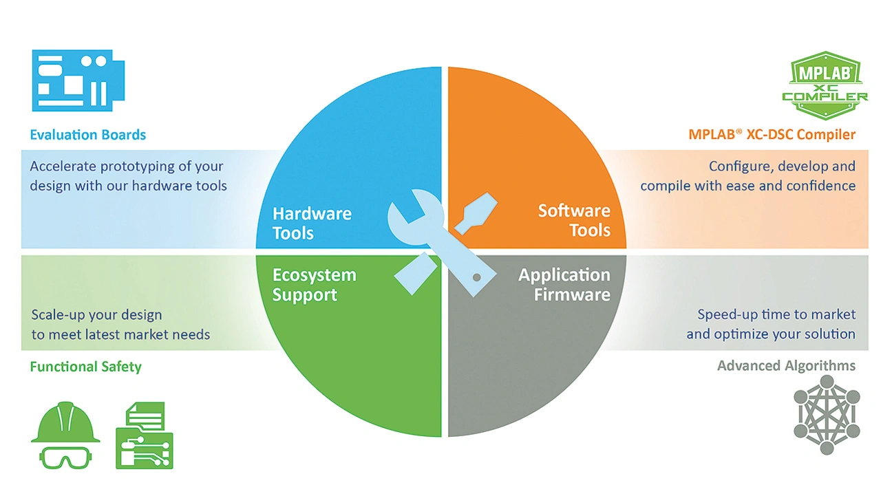 ➔ Vereinfachtes Entwicklungs-Ökosystem – die neue dsPIC33A-Serie rationalisiert die Entwicklung von Embedded-Systemen mit ihrem modellbasierten Design. Der Befehlssatz (ISA, Instruction Set Architecture) ist kompatibel mit bestehenden dsPIC33 DSCs, sodass ein Übergang von anderen Bausteinen problemlos möglich ist. Die neue Serie lässt sich einfach in den MPLAB XC DSC-Compiler und den MPLAB Code Configurator integrieren. Für die Bausteine steht das dsPIC33A Curiosity Development Board (EV74H48A) zur Verfügung, das Entwickler mit Modulen für die Motorsteuerung, für die digital geregelte Stromversorgung und ande- re Embedded-Anwendungen einfach nutzen können. Das Ökosystem wird in Kürze erweitert, um die Unterstützung für modellbasiertes Entwickeln, Motorsteuerung und DSP-Algorithmen für Sensorik, digital geregelte Stromversorgung und andere Anwendungen zu verbessern sowie die funktionale Sicherheit zu erhöhen (Bild 4).