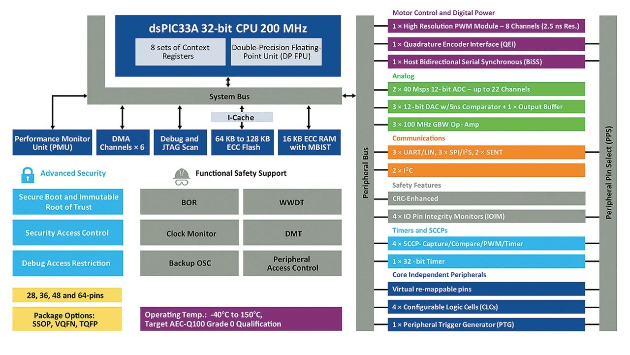 Wie Bild 3 zeigt, weisen die neuen dsPIC33A-Komponenten folgende sechs Besonderheiten auf: